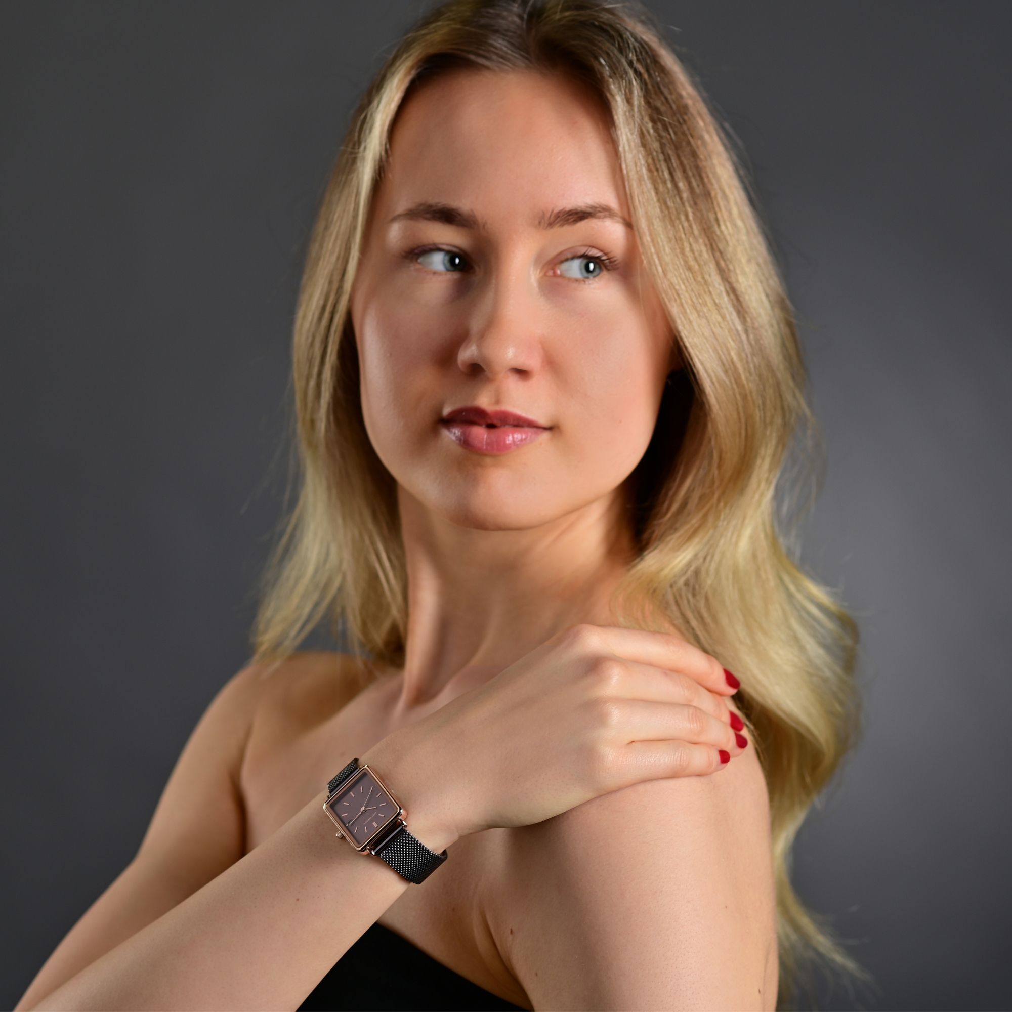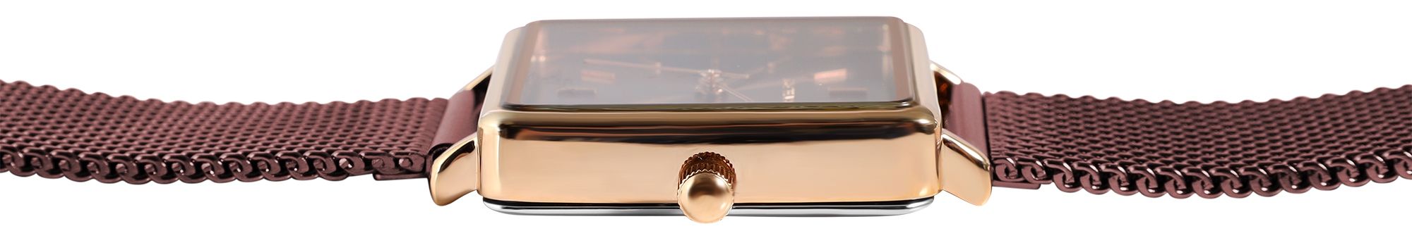Das schlanke Gehäuse im Format 29 x 26 x 7 mm verleiht der "Sienna" eine elegante und unaufdringliche Optik. Ein besonderes Highlight ist das edle Milanaiseband aus Edelstahl mit einer Bandbreite von 16 mm. Dieses ist komfortabel zu tragen und dank des praktischen Hakenverschlusses auch individuell an das Handgelenk anpassbar. Die Gesamtlänge der Uhr beträgt 22 cm.