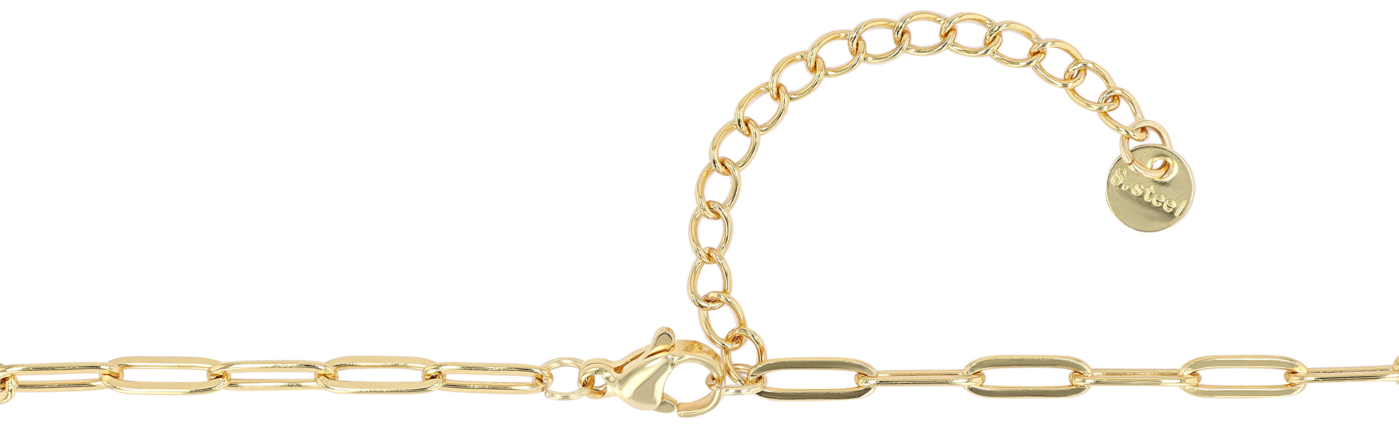 Gefertigt aus hochwertigem Edelstahl in strahlendem warmen Goldton, besticht diese Halskette durch ihre langlebige Qualität und ist zudem noch besonders hautverträglich. Für eine optimale Passform ist die Kette in den Längen 40 cm oder 45 cm erhältlich. Jede Variante bietet Ihnen durch eine zusätzliche 5 cm Verlängerung eine perfekte Anpassung an Ihren Ausschnitt.