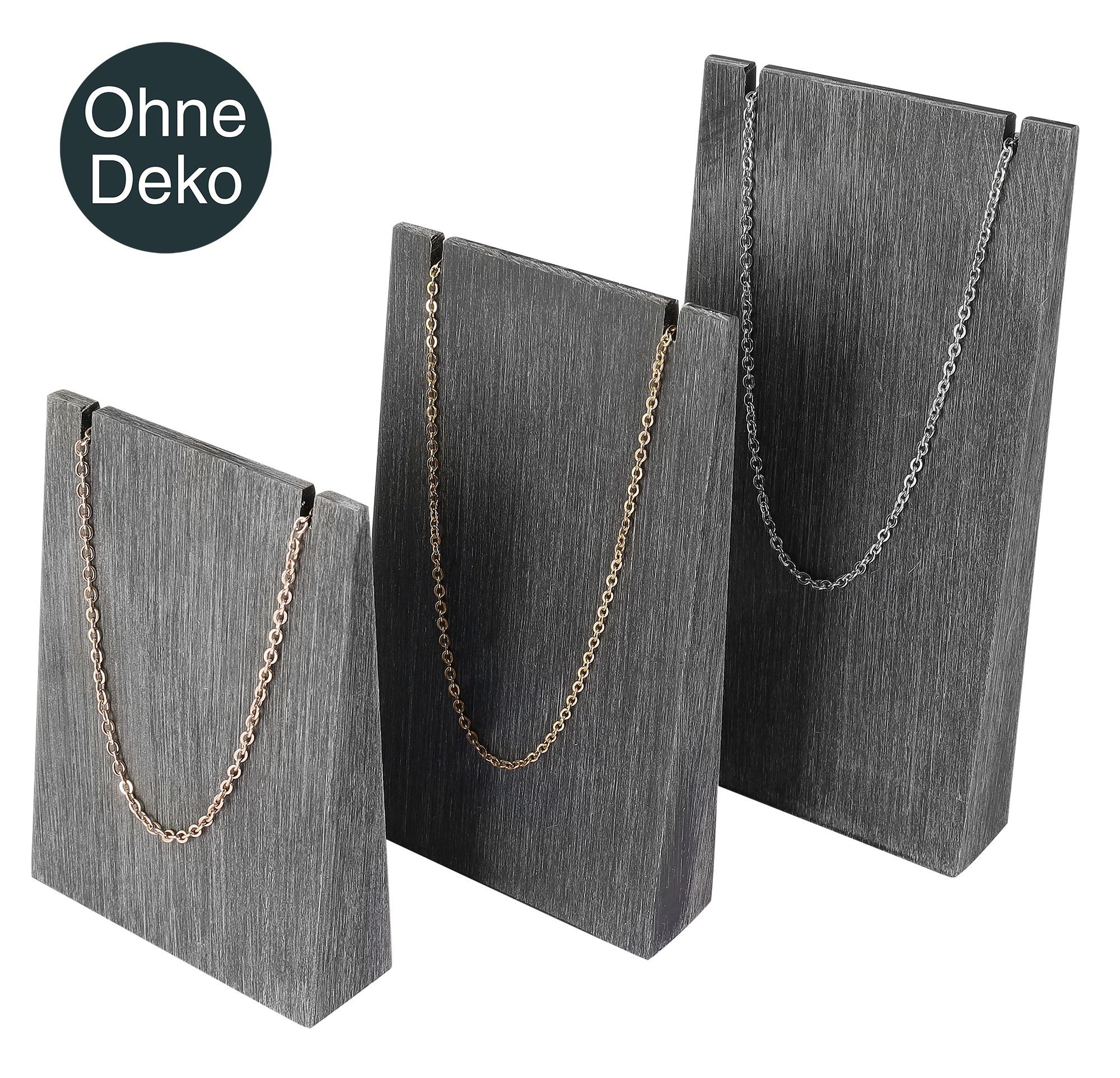 Bringen Sie Ordnung und Stil in Ihre Schmuckkollektion mit diesem praktischen Kettenaufsteller im 3er Set. Die schwarzen matten Aufsteller haben verschiedene Größen, um Ihre Schmuckstücke ideal in Szene setzen zu können. Sie sind nicht nur funktional, sondern auch ein stilvolles Dekoelement. Sie können die Halsketten organisiert und in Reichweite aufbewahren, damit Ihre Kunden einen tollen Überblick über Ihre Schätze haben können.