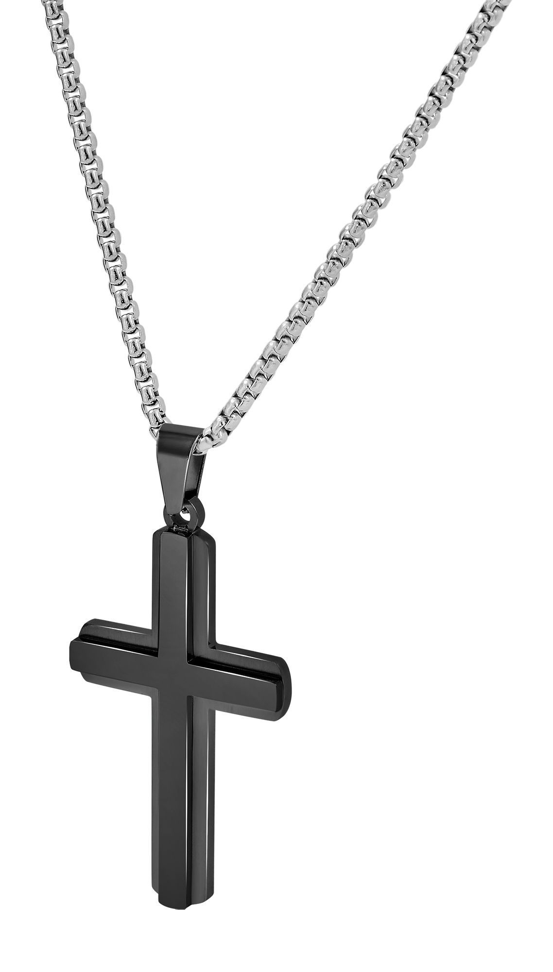 Der schwarze Anhänger der Marke Akzent in Form eines Kreuzes wurde aus Edelstahl gefertigt und mit einer hochwertigen Ionenplattierung veredelt. Das Material ist sehr robust, langlebig und eignet sich ideal für Allergiker, da sich Edelstahl als besonders hautverträglich erweist. Das Design des Anhängers wird durch einen sogenannten "Twin-Look" aufgewertet. Dabei ist auf dem Kreuzanhänger ein weiteres Kreuzelement aus Edelstahl angebracht und hebt sich gekonnt hervor. Das Kreuz besteht aus einem mattierten und polierten Finish und kann beliebig mit filigranen Gravuren versehen werden. Die Kombination aus mattierten und glänzenden Elementen machen diesen Anhänger dabei zu einem besonderen Accessoire. Aufgrund der ovalen Öse lässt sich dieser Anhänger mit jeder Art von Halskette kombinieren und somit im Handumdrehen ein neuer Look kreieren. Bitte beachten Sie, dass eine Kette nicht im Lieferumfang enthalten ist. Das Edelstahlkreuz hat eine Länge von 49 mm, eine Breite von 27 mm und eine Materialstärke von 3,5 mm.