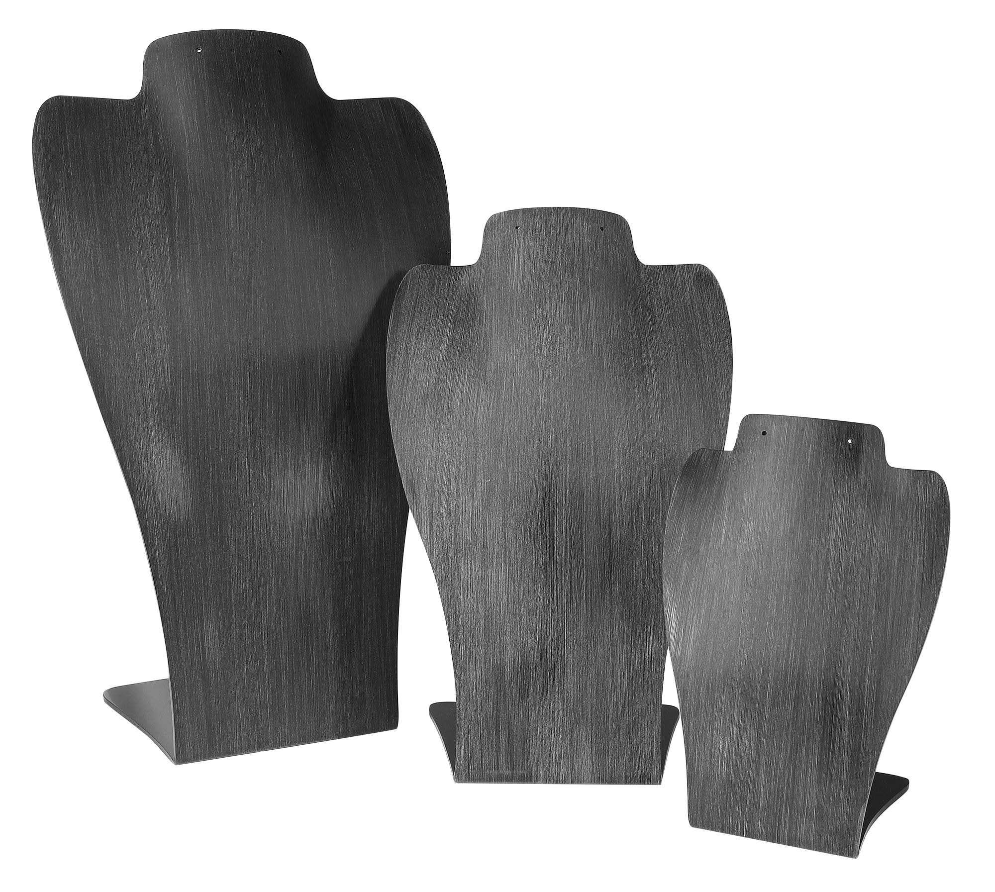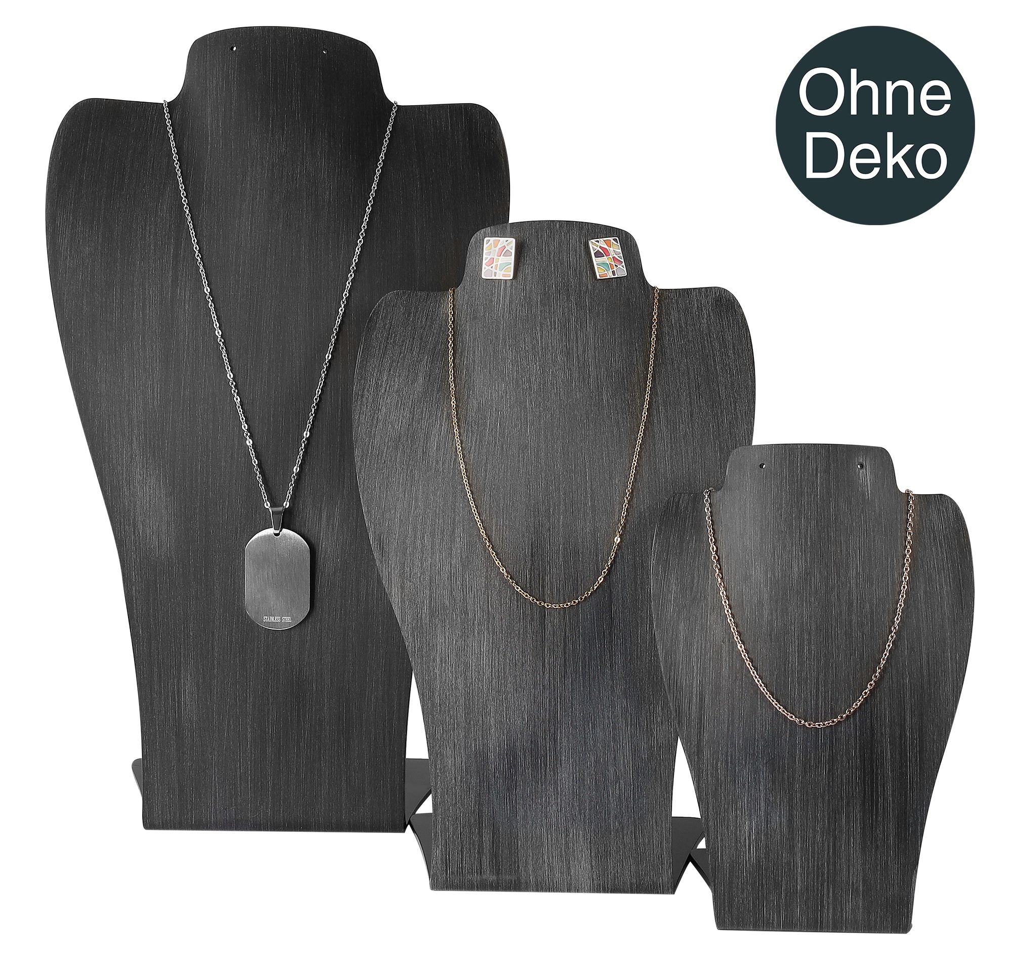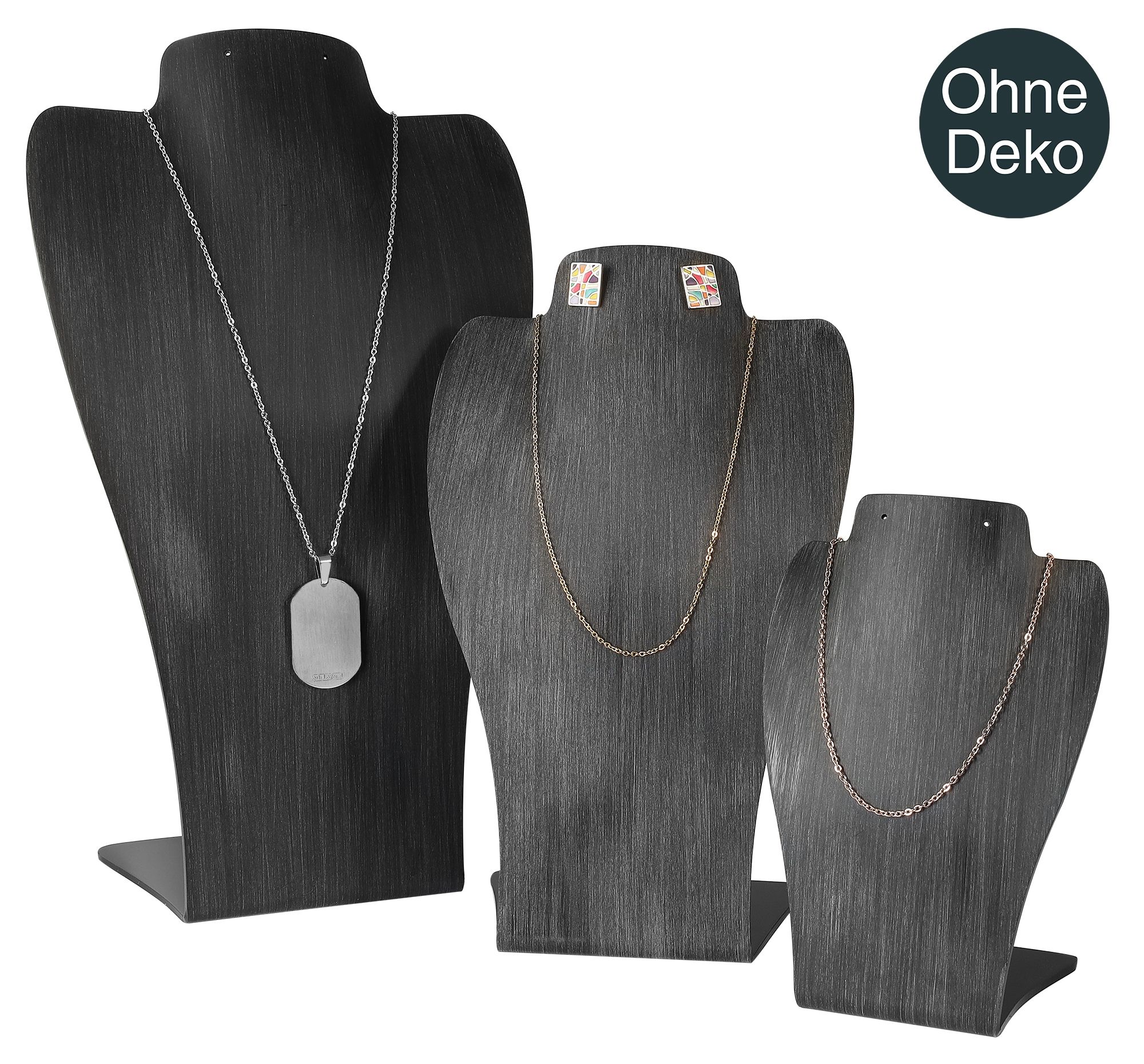 Displays aus Kunststoff für Schmucksets in der Farbe schwarz gebürstet. Die Displays kommen in einem 3er Set, in verschiedenen Größen und sind in zwei Varianten erhältlich. Beide Varianten lassen sich hervorragend für die Präsentation von Schmuckartikeln wie z.B. Ketten und Colliers verwenden. Durch feine Löcher am oberen Halsanfang ist es möglich, Ohrstecker sowie Ohrringe zu befestigen.