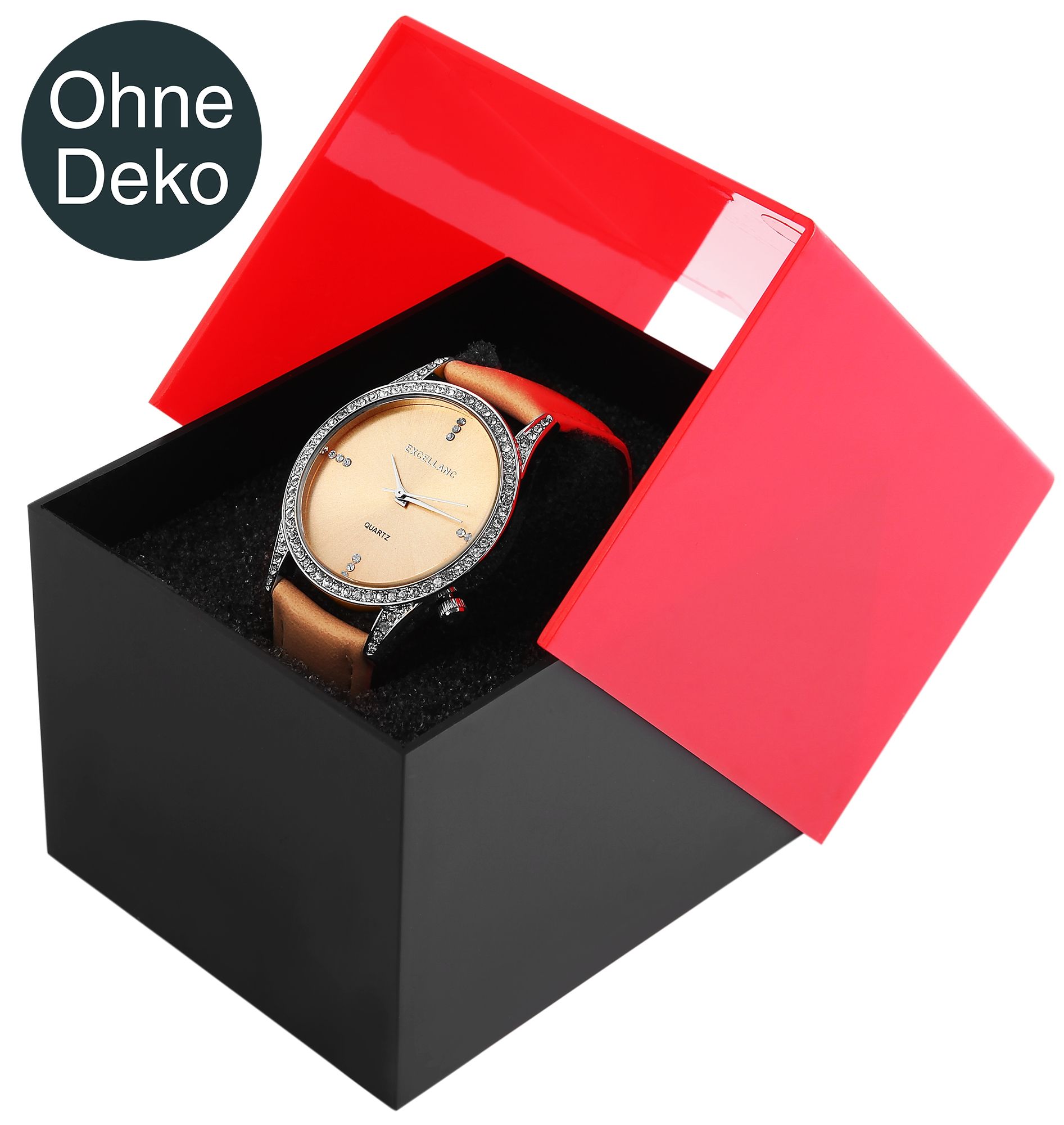 Die Uhrenbox wurde aus Kunststoff gefertigt, der untere Teil ist schwarz, der Deckel rot gehalten. Im Inneren befindet sich ein grauer Schaumstoffeinsatz mit einem herausnehmbaren Uhrenkissen. Die Box eignet sich hervorragend zur Präsentation und Aufbewahrung von Uhren, aber auch für andere geeignete Schmuckstücke. Die glänzende Optik und der besondere Klappmechanismus verschaffen der Verpackung ein einzigartiges Design. Die Größe der Uhrenbox ergibt sich aus einer Länge von 9,9 cm, einer Breite von 8,1 cm und einer Tiefe von 6,8 cm.