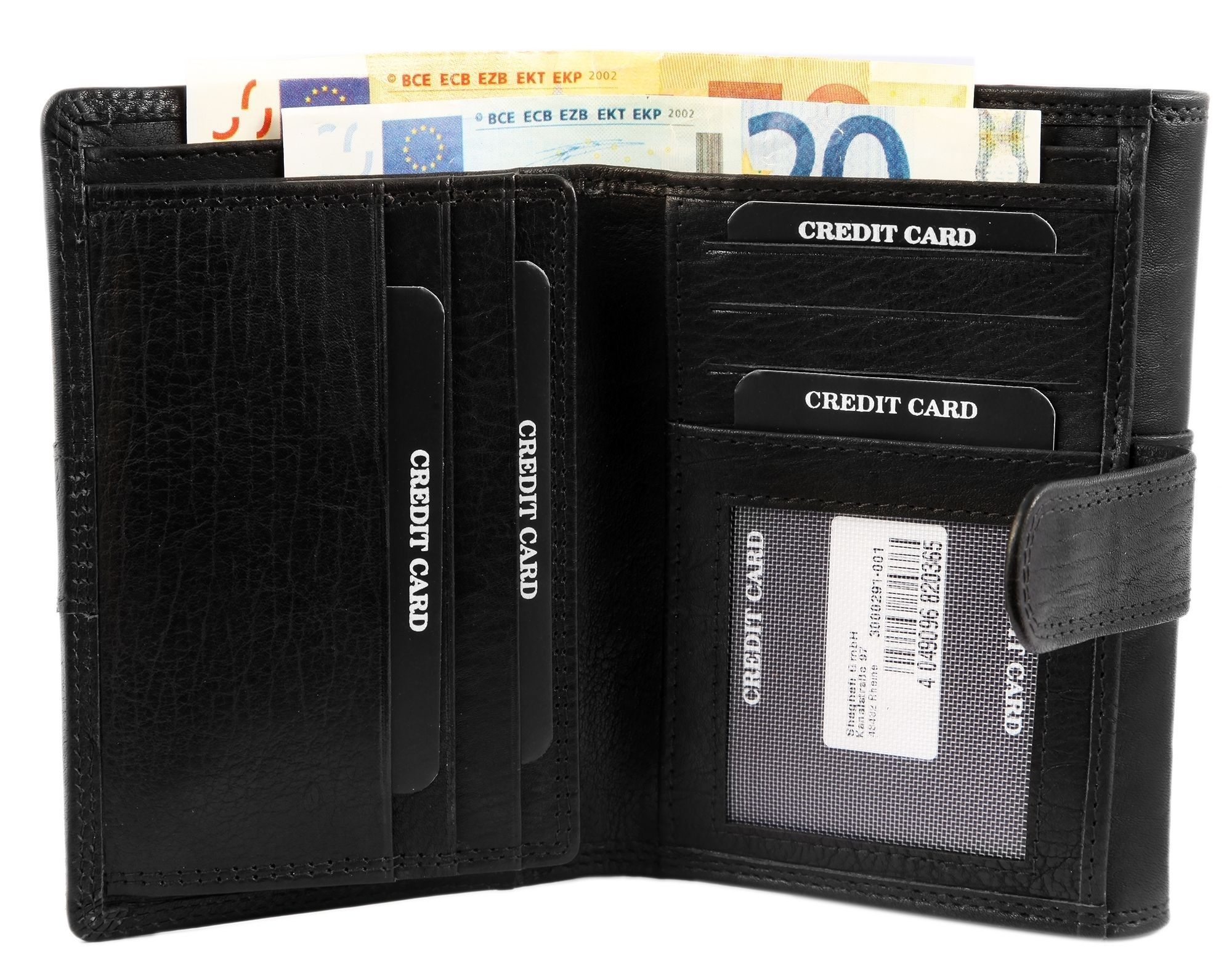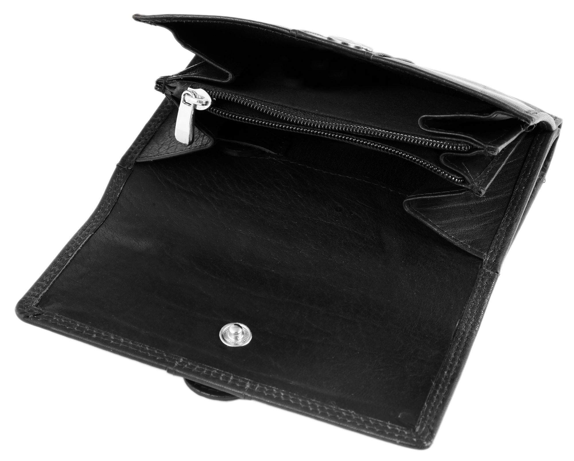 Die schwarze Damengeldbörse der Marke Leonardo Verrelli wurde aus echtem Rindsleder gefertigt und zeigt sich im modernen Vintage-Look. Je nach Haltung ist die Börse sowohl im Quer-als auch im Hochformat. Das Innenfutter besteht aus Synthetik. Die Naht im Außen- und Innenbereich des Portemonnaies sorgt für eine gute Haltbarkeit und Stabilität. Die Geldbörse ist ein wahres Platzwunder und bietet viel Stauraum für alle wichtigen Dokumente. Aufgeteilt ist die Börse in 11 Kreditkartenfächer, 2 Geldscheinfächer, 2 Münzfächer mit Einkaufschip, 1 Münzfach mit Reißverschluss, 2 Einsteckfächer und 1 transparentes Ausweisfach. Verschlossen wird die Geldbörse mit einem praktischen Druckknopfverschluss im Außenbereich. Die Größe ergibt sich ungefüllt aus einer Länge von 14 cm, einer Breite von 10 cm und einer Stärke von 3,5 cm.