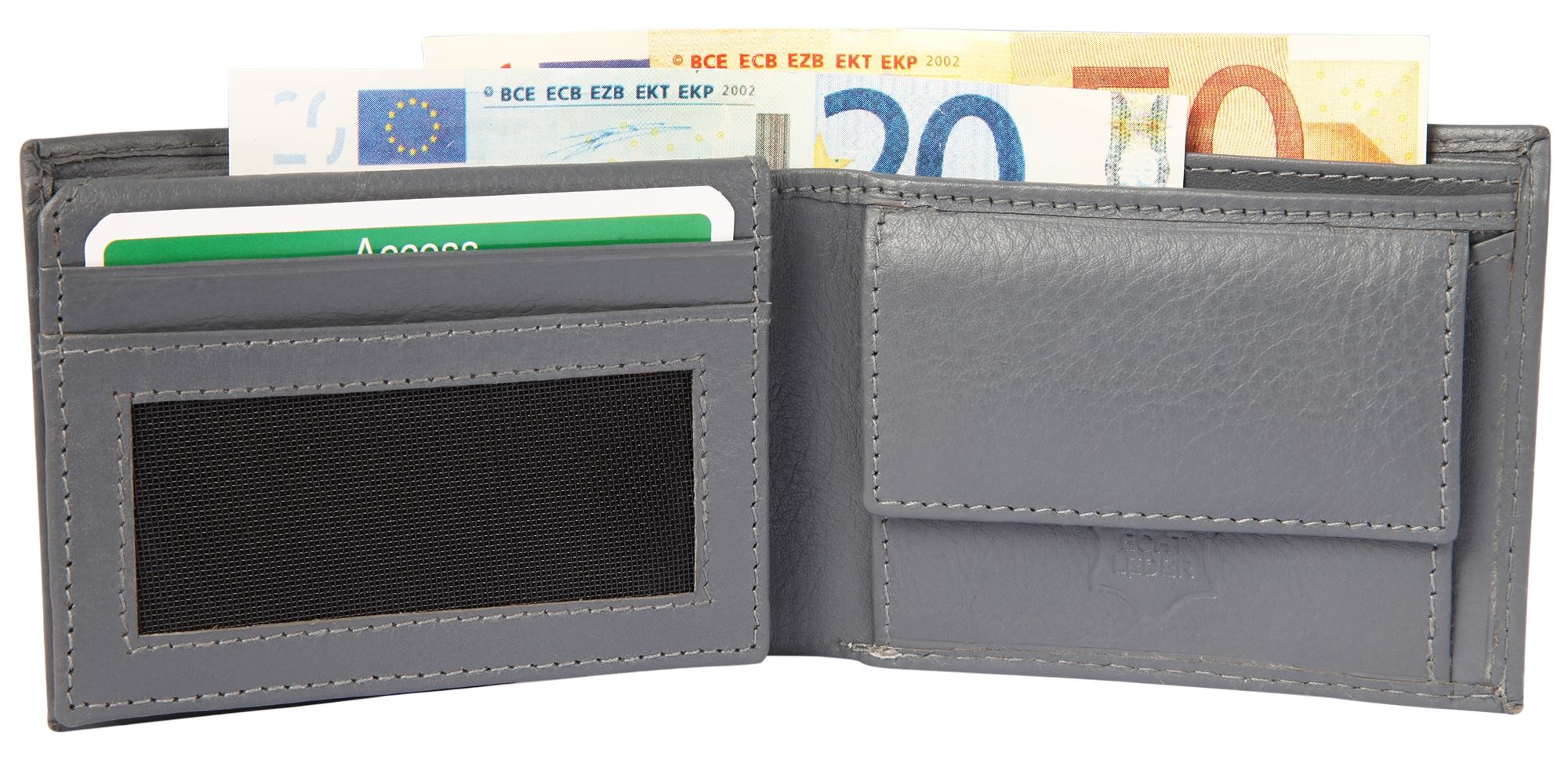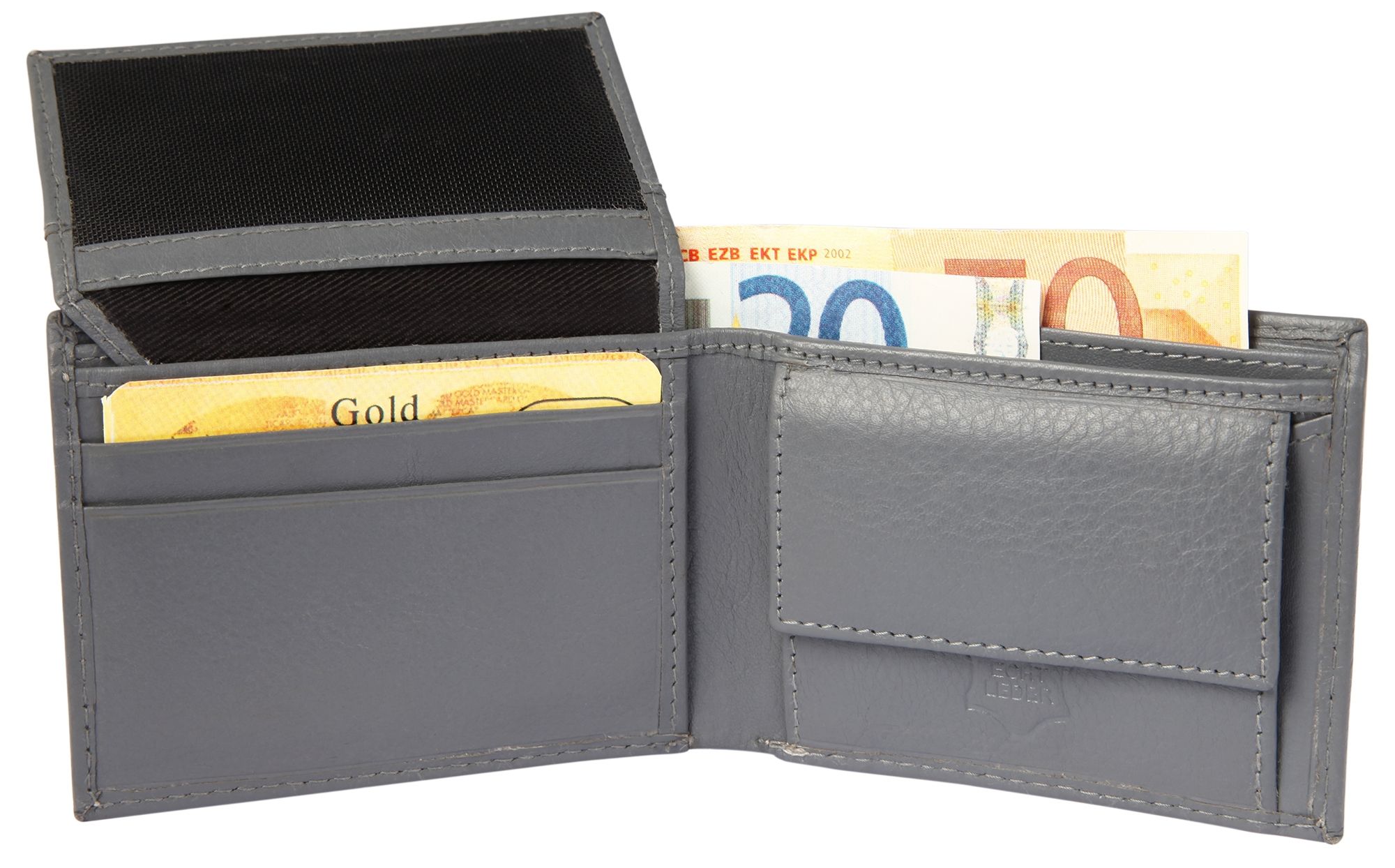 Die graue Herrengeldbörse im Querformat der Marke Leonardo Verrelli wurde aus echtem Rindsleder gefertigt. Die sorgfältig verarbeitete Naht im Außen- und Innenbereich des Portemonnaies sorgt für eine gute Haltbarkeit und Stabilität. Aufgeteilt ist die Börse in 4 Kreditkartenfächer, 2 Geldscheinfächer, 1 Münzfach, 2 Einsteckfächer und 1 transparente Ausweisfach. Die Größe ergibt sich ungefüllt aus einer Länge von 7,7 cm, einer Breite von 10,3 cm und einer Stärke von 2,5 cm. Dank der Größe passt die Börse sowohl in die Vordertasche als auch in die Gesäßtasche und bietet ausreichend Platz, um alle wichtigen Wertsachen für unterwegs sicher und organisiert aufzubewahren.