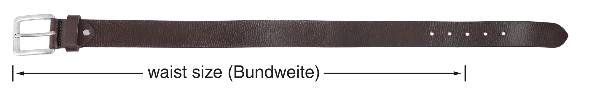 Hinweis: Unsere Gürtel mit Dornschließe messen die Bundweite ohne Schließe bis zum mittleren Loch (+/- 5 cm). Die Gesamtlänge wird mit Dornschließe gemessen.