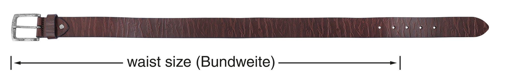 Hinweis: Unsere Gürtel mit Dornschließe messen die Bundweite ohne Schließe bis zum mittleren Loch (+/- 5 cm). Die Gesamtlänge wird mit Dornschließe gemessen.