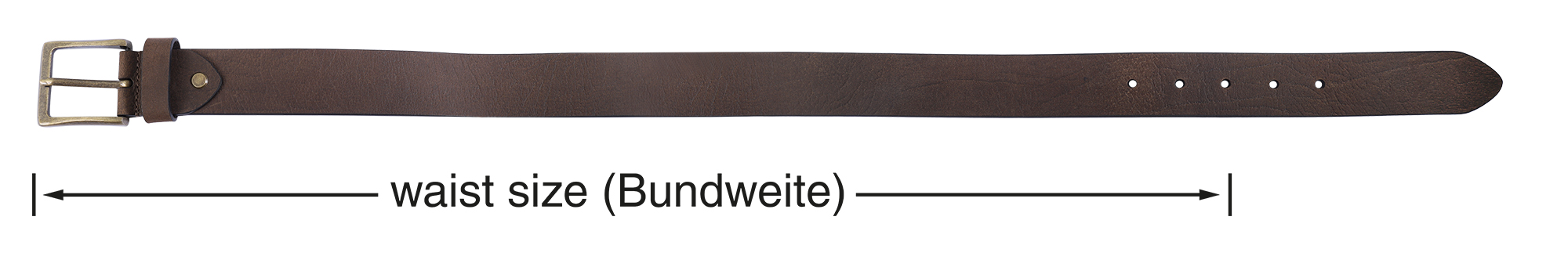 Hinweis: Unsere Gürtel mit Dornschließe messen die Bundweite ohne Schließe bis zum mittleren Loch (+/- 5 cm). Die Gesamtlänge wird mit Dornschließe gemessen.