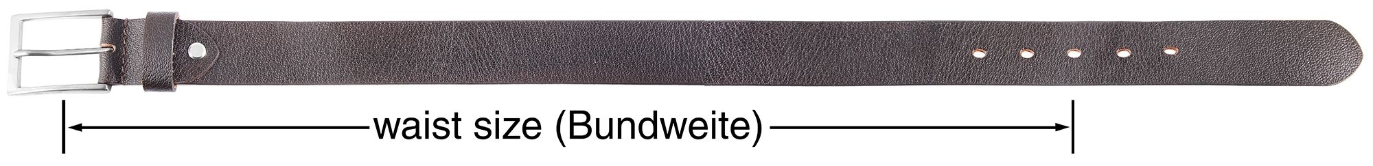 Hinweis: Unsere Gürtel mit Dornschließe messen die Bundweite ohne Schließe bis zum mittleren Loch (+/- 5 cm). Die Gesamtlänge wird mit Dornschließe gemessen.