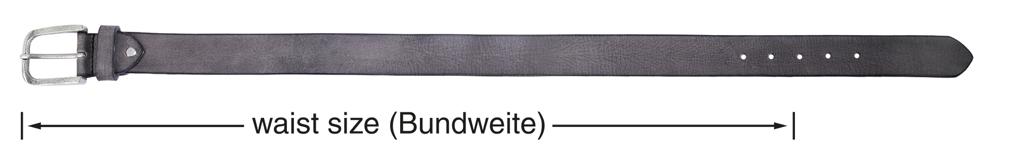 Hinweis: Unsere Gürtel mit Dornschließe messen die Bundweite ohne Schließe bis zum mittleren Loch (+/- 5 cm). Die Gesamtlänge wird mit Dornschließe gemessen.