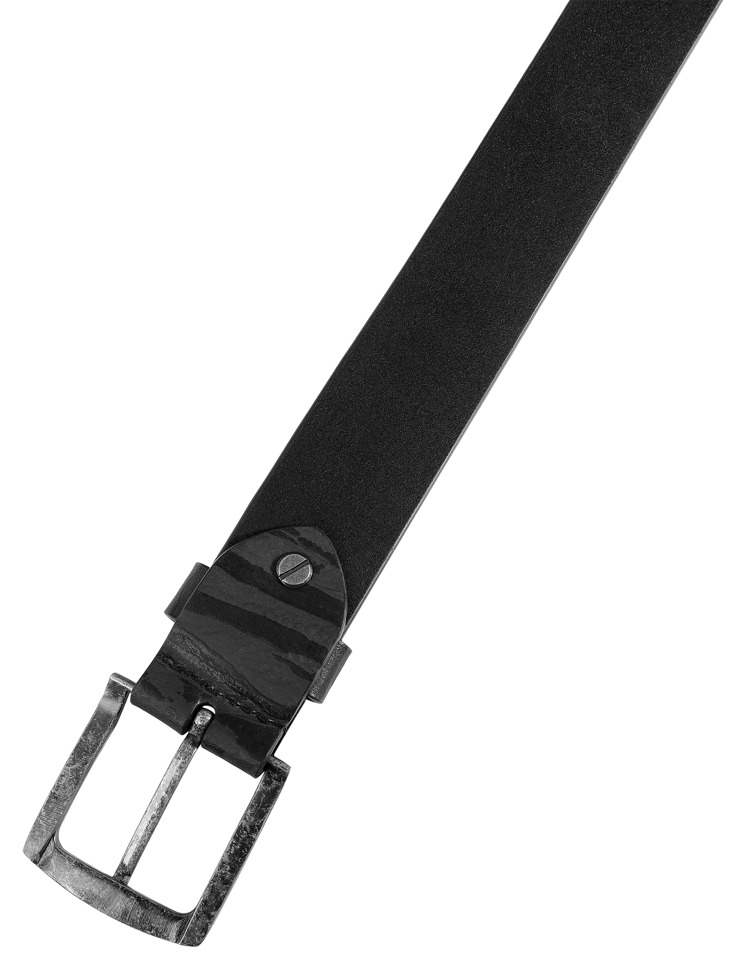 Die Dornschließe in matt Silber mit zusätzlichen geschwärzten Details verleiht dem schwarzen Gürtel einen modernen Basic-Look.