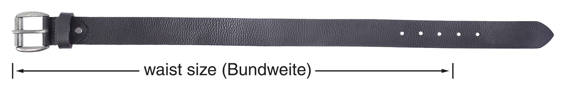Hinweis: Unsere Gürtel mit Dornschließe messen die Bundweite ohne Schließe bis zum mittleren Loch (+/- 5 cm). Die Gesamtlänge wird mit Dornschließe gemessen.