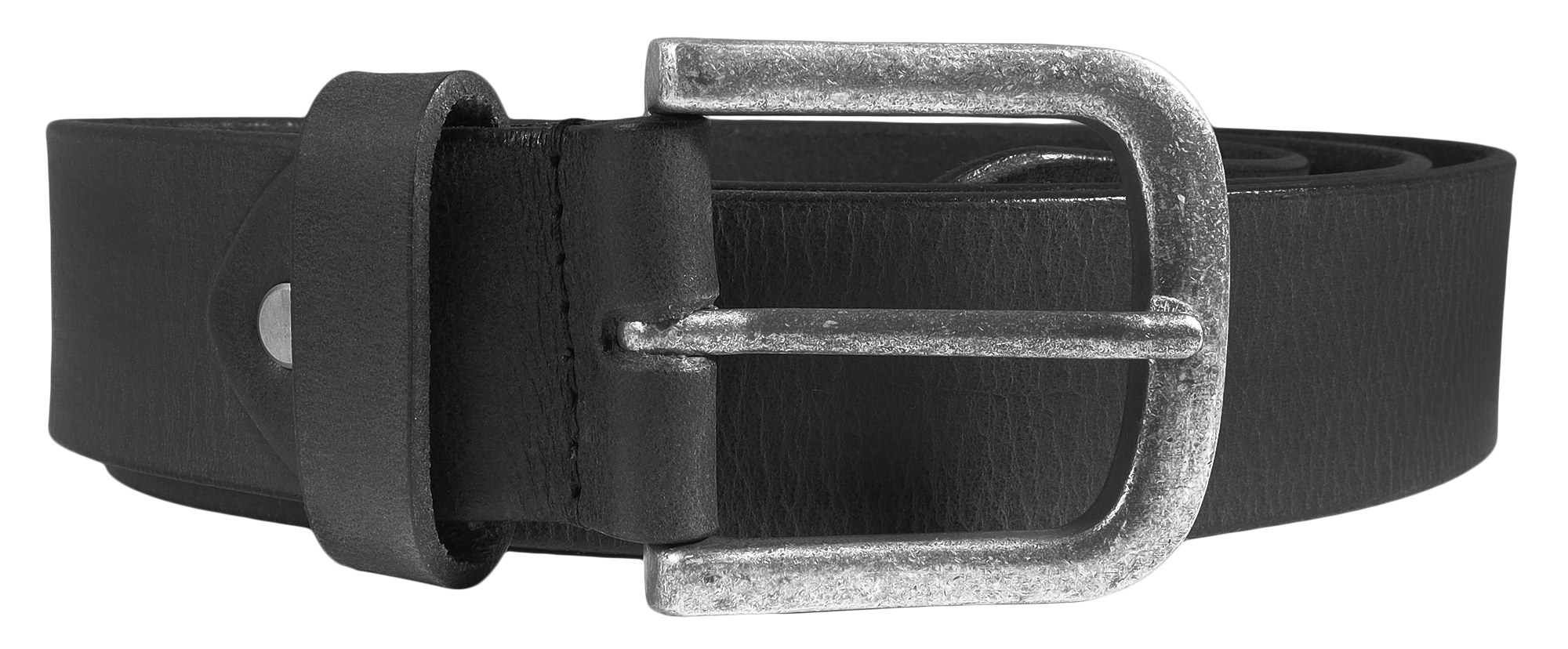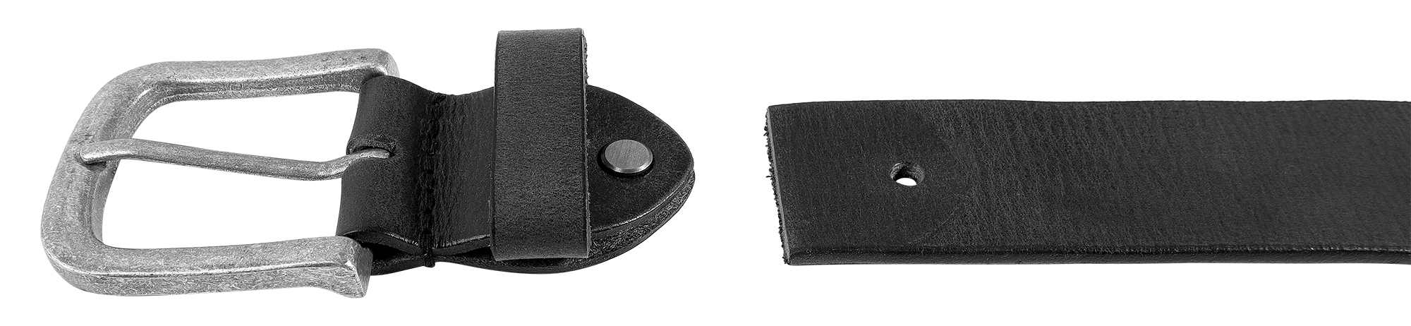 Die Dornschließe in Silber mit geschwärzten Details. Ein moderner Blickfang am Gürtel. Mit einer Breite von 3,8 cm entspricht dieser Gürtel dem gängigen Standard und passt ideal zu Hosen aller Art.