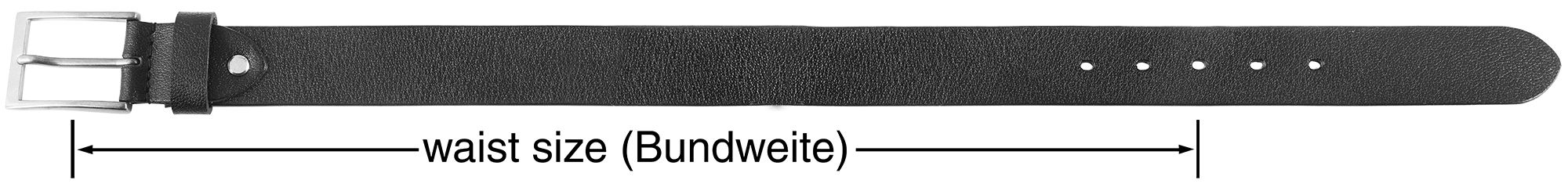 Hinweis: Unsere Gürtel mit Dornschließe messen die Bundweite ohne Schließe bis zum mittleren Loch (+/- 5 cm). Die Gesamtlänge wird mit Dornschließe gemessen.