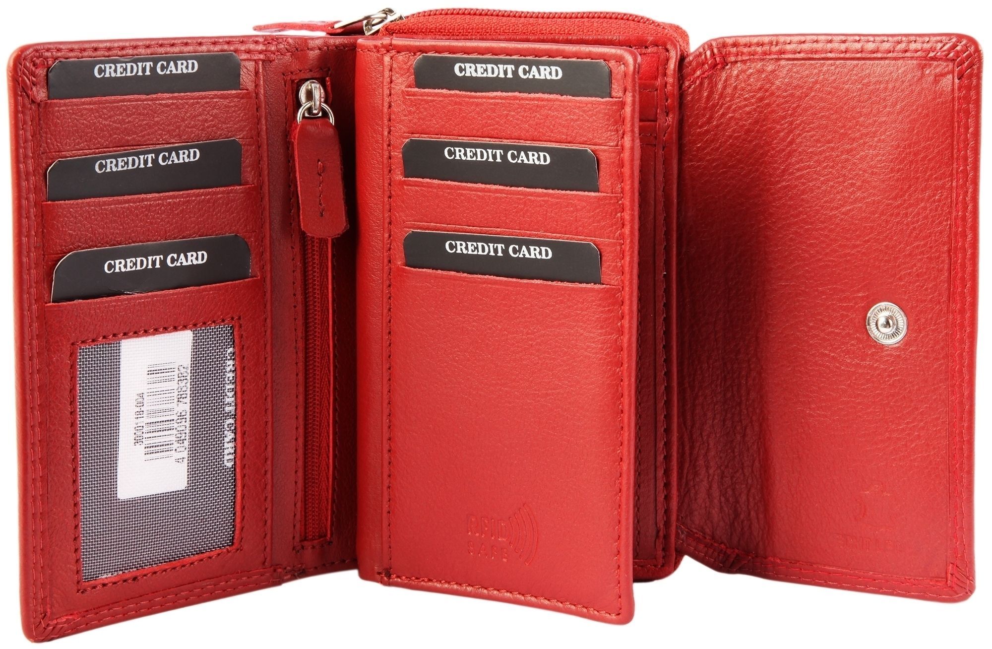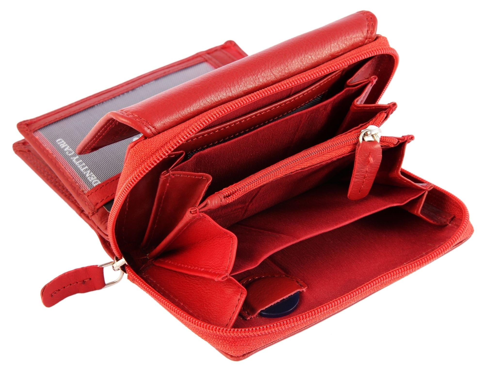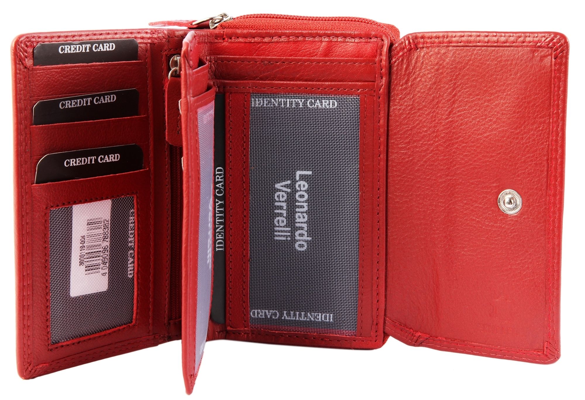 Die rote Geldbörse der Marke Leonardo Verrelli ist aus Echtleder im Querformat gefertigt. Sie ist zweigeteilt und lässt sich einerseits mit einem Reißverschluss und auf der anderen Seite mit einem klassischen Druckknopf öffnen und schließen. Der Druckknopf ist auf zwei verschiedene Stufen einstellbar. Im aufgeklappten Zustand befinden sich links vier Kartenfächer und ein transparentes Ausweisfach und rechts fünf weitere Kartenfächer. Beide Seiten sind durch einen Reißverschluss getrennt, hinter dem sich ein weiteres verstecktes Fach verbirgt, das über beide Hälften reicht. Außerdem befindet sich unter den Kartenfächern jeweils ein großes Einsteckfach. Der Mittelteil ist umklappbar. Zum Vorschein kommen zwei tiefe Geldscheinfächer in dem die Wertpapiere sicher verstaut werden können. Außerdem besteht die Möglichkeit zwei Ausweisdokumente hinter transparenten Ausweisfächern zu verstauen. Das Reißverschlussfach lässt sich wie eine Zieharmonika aufklappen und bietet vier Münzfächer, die mittig durch ein schmales Fach getrennt werden. Dieses Fach lässt sich separat mit einem Reißverschluss öffnen. Im ersten Fach besteht erneut die Möglichkeit eine Karte zu verstauen und im letzten Fach befindet sich ein kleines genähtes Fach für einen Einkaufschip. Die Besonderheit dieser Geldbörse ist, dass sie mit einem RFID-Schutz versehen ist. Dies ist eine Schutzschicht, die in das Portemonnaie eingearbeitet ist und verhindert, das Unbefugte Daten, wie zum Beispiel von der Kreditkarte, auslesen können. Die Maße ergeben sich aus einer Länge von 9 cm, einer Breite von 14,5 cm und einer Höhe von 4 cm.
