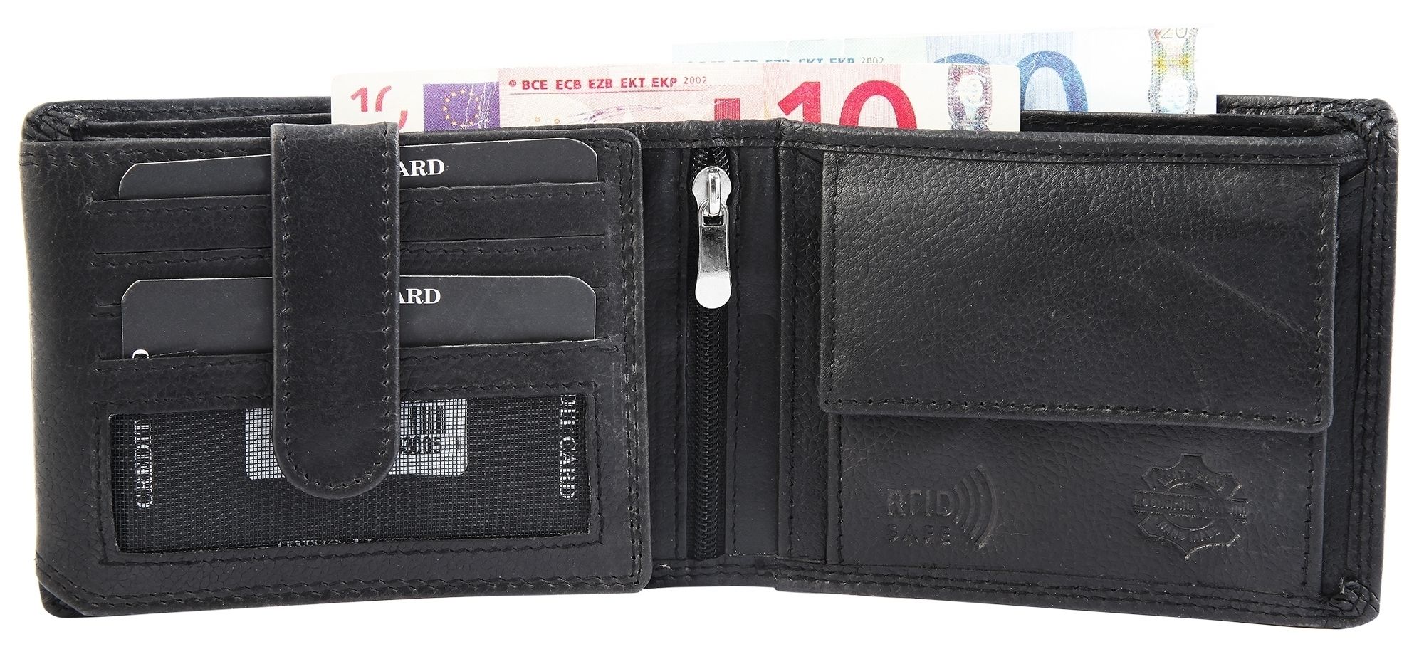 Die Geldbörse der Marke Leonardo Verrelli wurde im Querformat aus echtem Rindsleder gefertigt und zeigt sich im modernen Vintagelook mit leichter Narbengebung. Die Doppelnaht im Außen- und Innenbereich des Portemonnaies sorgt für eine gute Haltbarkeit und Stabilität. Die Geldbörse ist ein wahres Platzwunder und bietet viel Stauraum für alle wichtigen Dokumente. Dennoch hat sie eine praktische Größe, die in jede Hosentasche passt. Aufgeteilt ist die Börse in 8 Kreditkartenfächer, 2 Geldscheinfächer, 1 Münzfach mit Einkaufschip, 1 Reißverschlussfach im inneren Bereich, 2 Einsteckfächer und 1 transparentes Ausweisfach, die mit einem praktischen Druckknopfverschluss gesichert werden können. Die Größe ergibt sich ungefüllt aus einer Länge von 9,4 cm, einer Breite von 12,3 cm und einer Stärke von 2,5 cm. Dank des integrierten RFID-Schutzes sind jegliche Chip-Karten vor Betrugsangriffen geschützt. Geliefert wird das Produkt in einer tollen Geschenkbox von Leonardo Verrelli, sodass es sich auch ideal als Geschenk eignet.