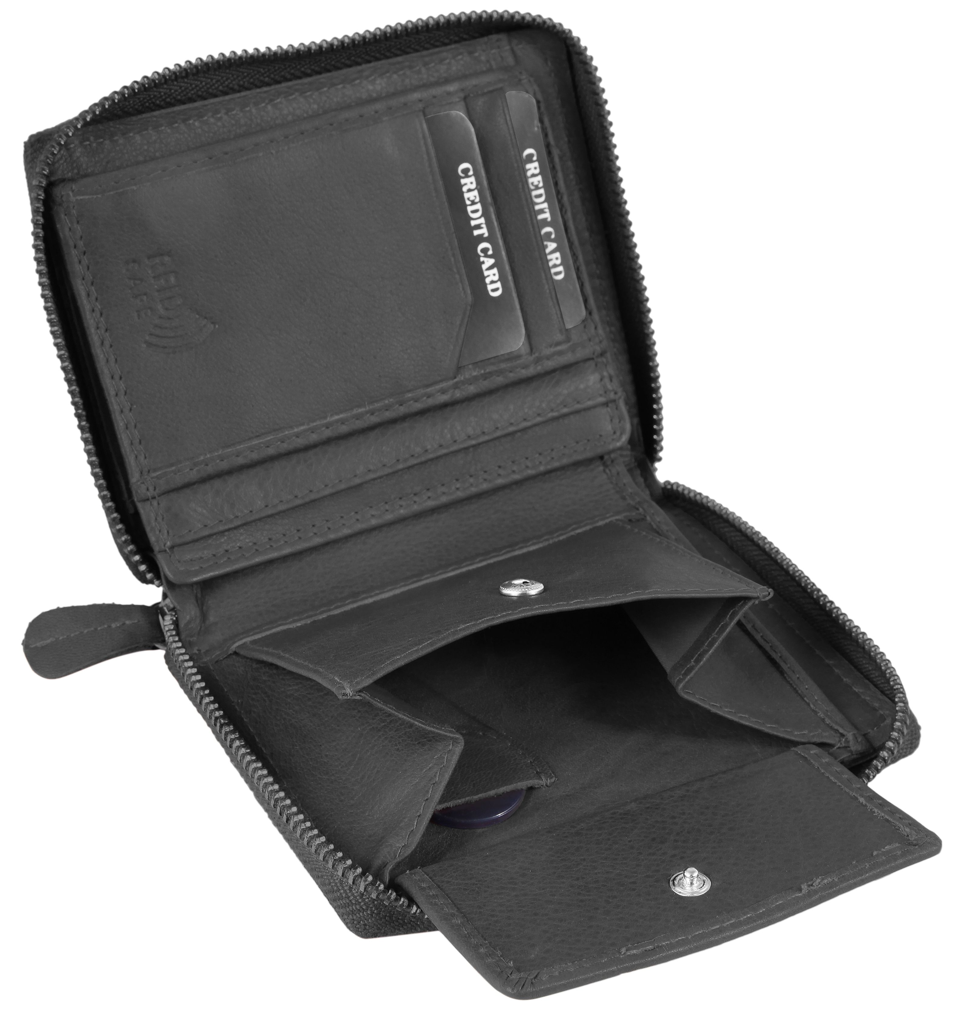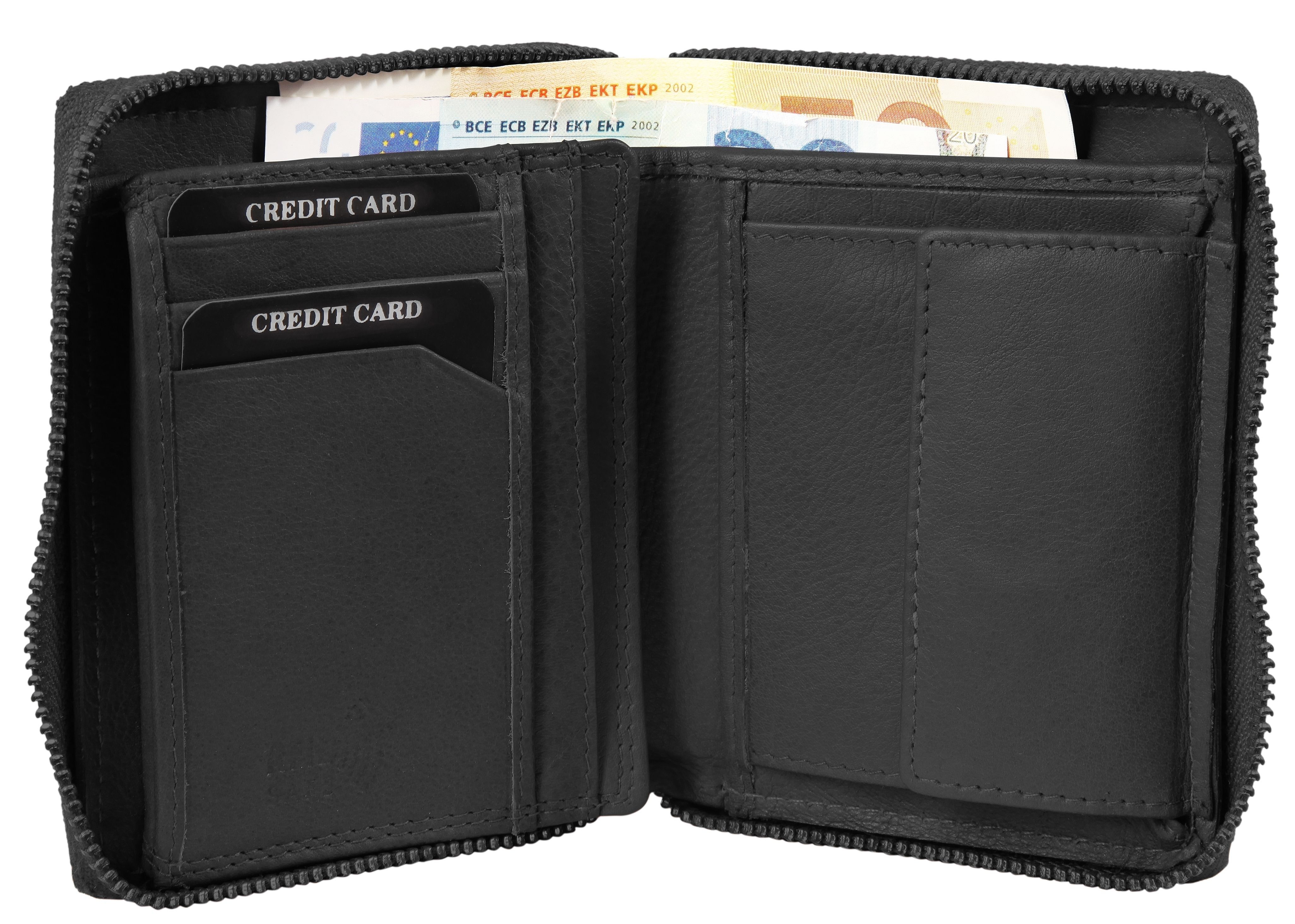 Die schwarze Geldbörse im Hochformat der Marke Leonardo Verrelli wurde aus echtem Rindsleder gefertigt und zeigt sich im modernen Vintagelook. Das Innenfutter besteht ebenfalls aus Echtleder. Die schwarze Doppelnaht im Außen- und Innenbereich des Portemonnaies sorgt für eine gute Haltbarkeit und Stabilität. Die Geldbörse ist ein wahres Platzwunder und bietet viel Stauraum für alle wichtigen Dokumente. Aufgeteilt ist die Börse in 6 Kreditkartenfächer, 1 Geldscheinfach, 1 Münzfach, 7 Einsteckfächer und 1 transparentes Ausweisfach. Des Weiteren wird die Börse durch einen Reißverschluss geöffnet und verschlossen, sodass der Inhalt sicher verstaut und geschützt ist. Die Größe ergibt sich ungefüllt aus einer Länge von 12,5 cm, einer Breite von 10,2 cm und einer Stärke von 2,9 cm. Dank des integrierten RFID-Schutzes sind jegliche Chip-Karten vor Betrugsangriffen geschützt. Geliefert wird das Produkt in einer tollen Geschenkbox von Leonardo Verrelli.