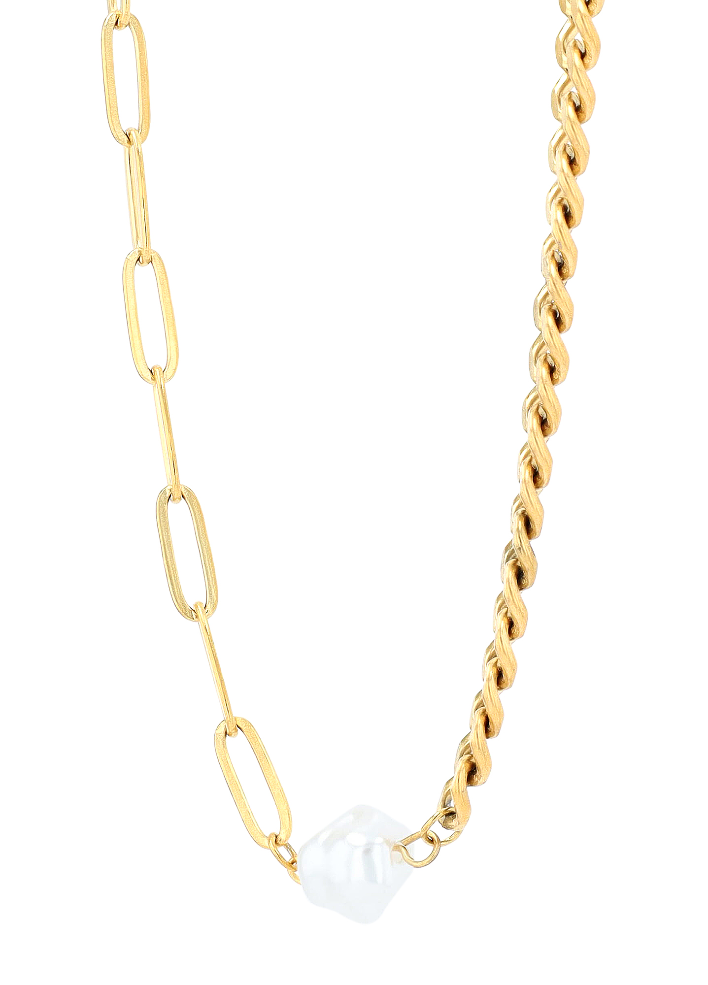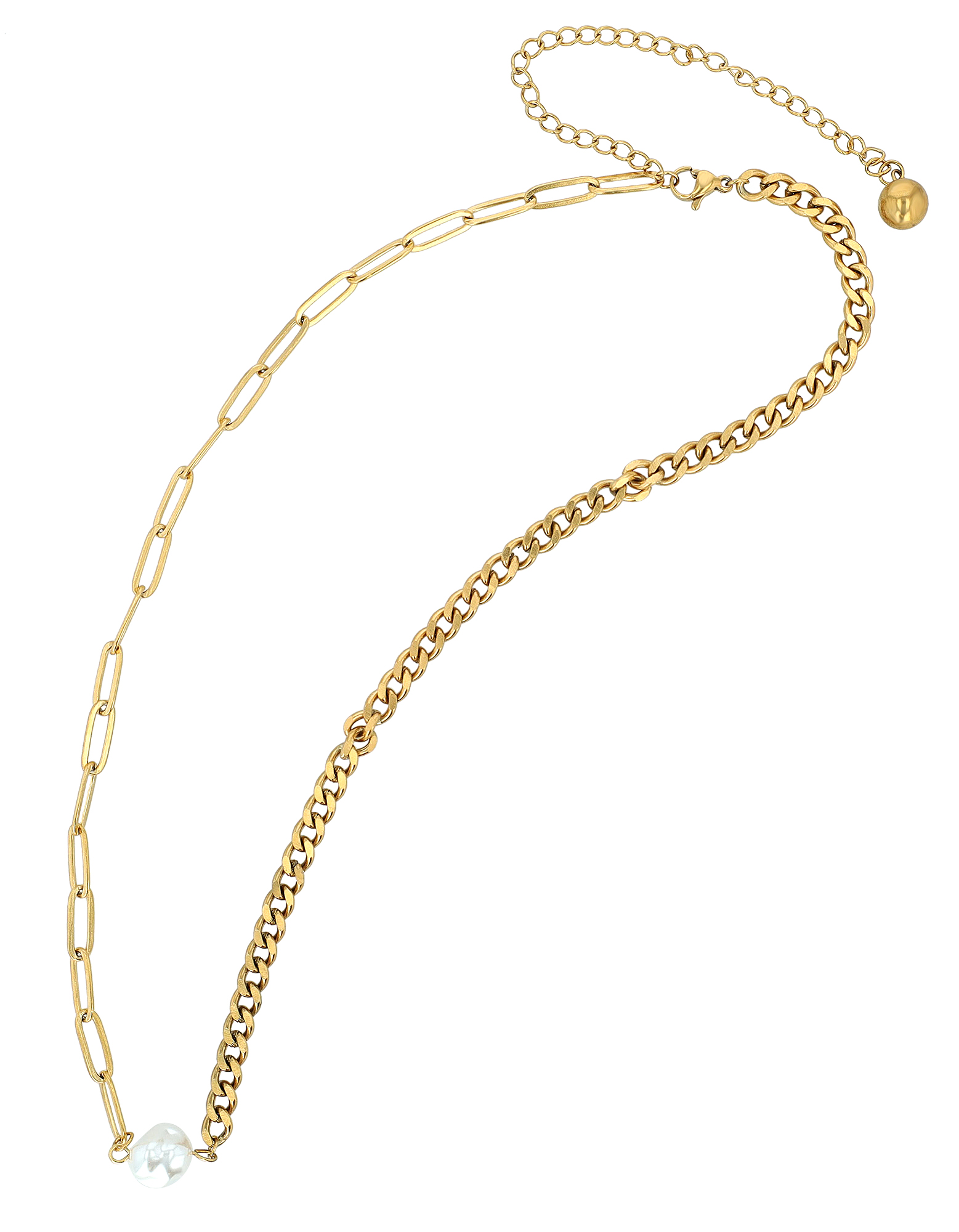 Die zweigeteilte Duo-Kette vereint auf harmonische Weise zwei unterschiedliche Gliederarten. Auf der einen Seite zeigt sich eine klassische markante Flachpanzerkette, während die andere Seite durch markante, grobe Kettenglieder (Paperclip-Stil) besticht. Getrennt werden die beiden Kettenabschnitte durch eine edle, weiße Perle (Ø ca. 9 mm), die als verbindendes Element im Zentrum steht. Mit einer Basis-Länge von 45 cm und einer großzügigen 10 cm Verlängerung lässt sich die Kette individuell an jeden Ausschnitt anpassen.