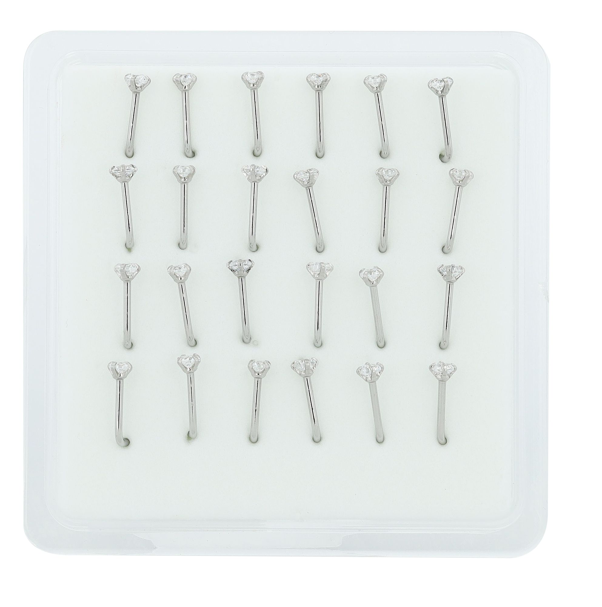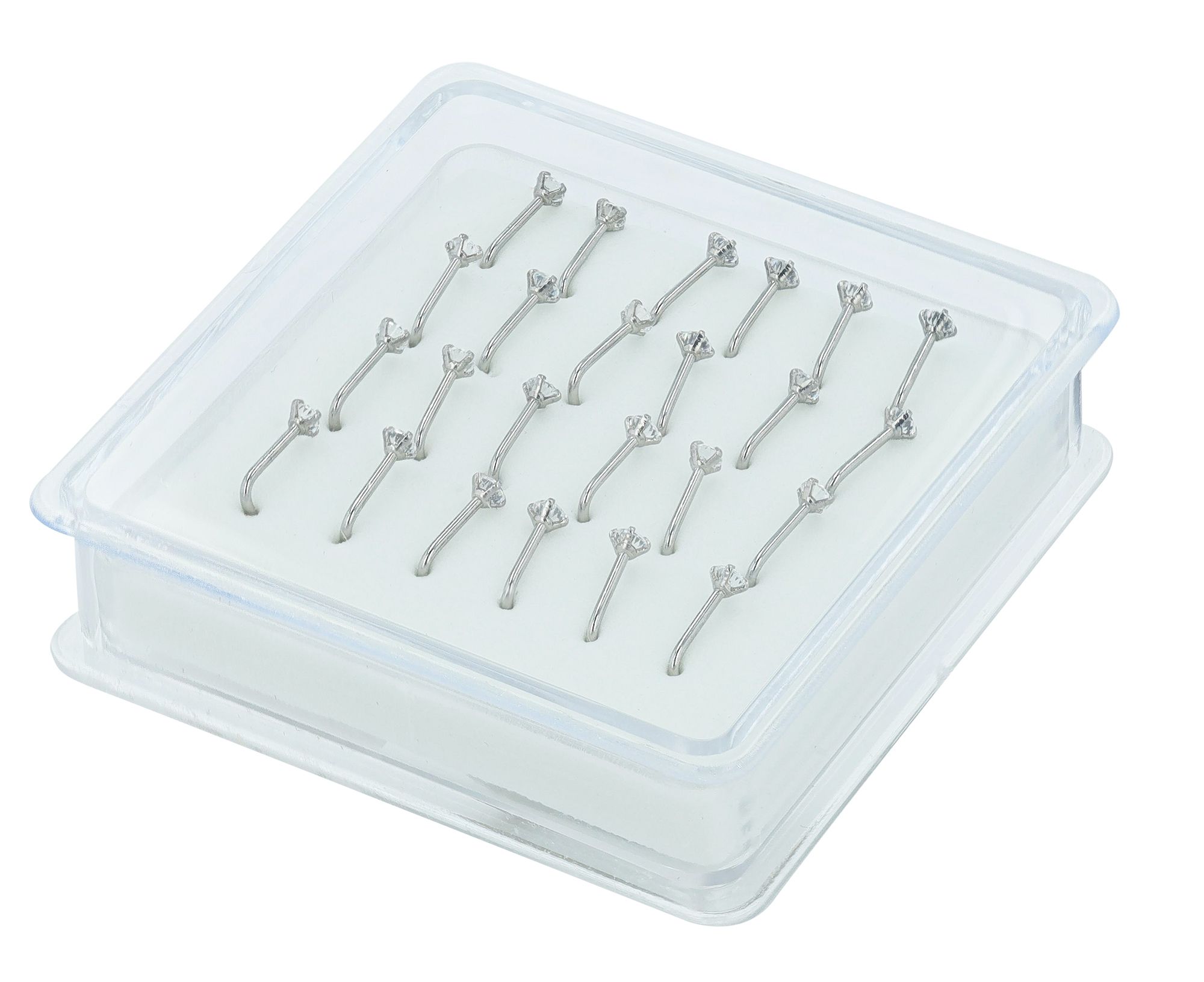 Unsere Nasenpiercings sind aus hochwertigem Edelstahl gefertigt, einem Material von höchster Qualität und Langlebigkeit. Die Verwendung dieses Materials macht diese Nasenpiercings nicht nur robust, sondern auch hypoallergen. Menschen mit empfindlicher Haut können sich darauf verlassen, dass diese Piercings keine allergischen Reaktionen hervorrufen. Jedes Set enthält 24 Piercings mit einer Stabstärke von 0,8 mm und einer Stablänge von 7 mm. Die eleganten Zirkonia an den Enden gibt es in zwei Größen: Ø 2 mm oder Ø 2,5 mm.