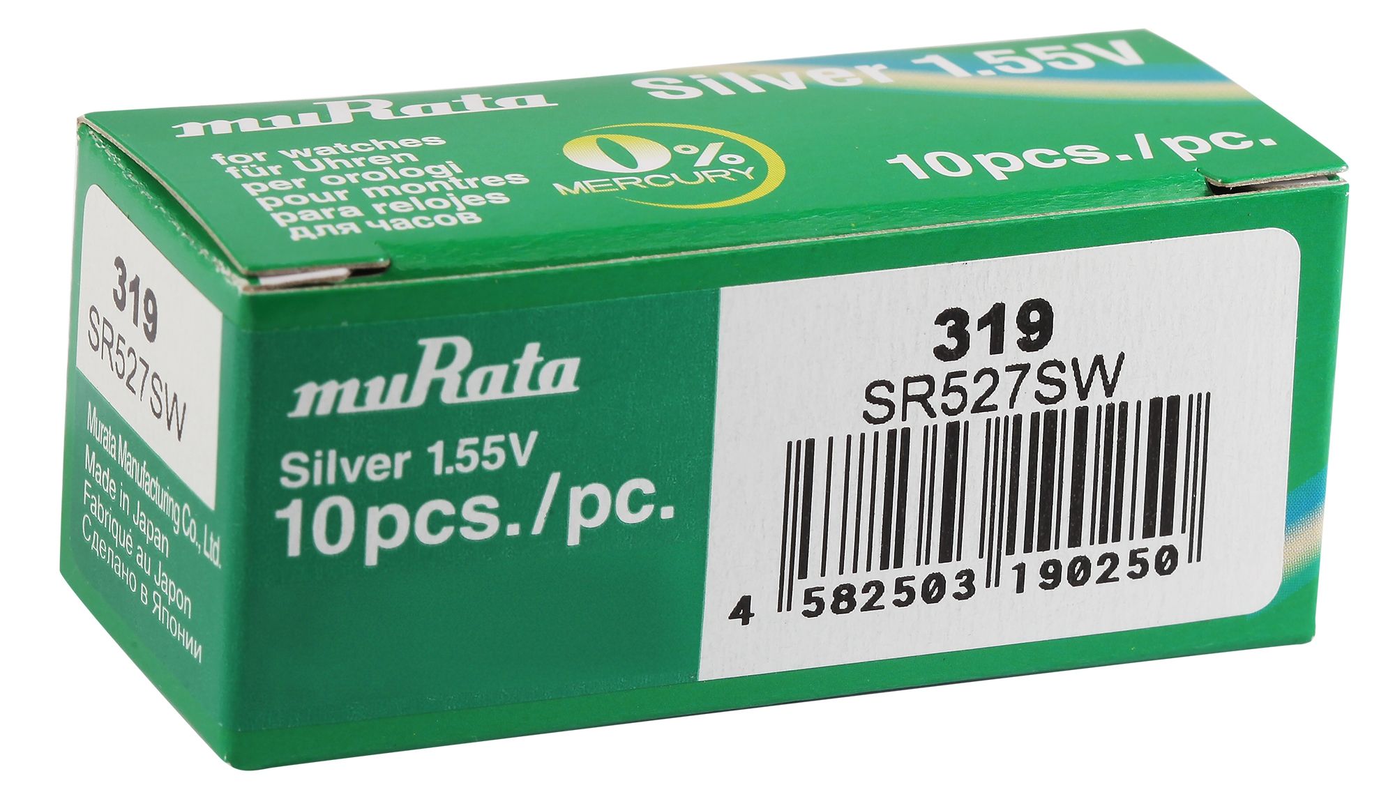 Knopfzellen Nr. 319 der Marke Murata für Uhren mit 0% Quecksilber im 10er- Blister, einzeln verpackt. Verschiedene Größen für verschiedene Uhrwerke. Die elektrische Spannung für jede Batterie beträgt 1,55 V.