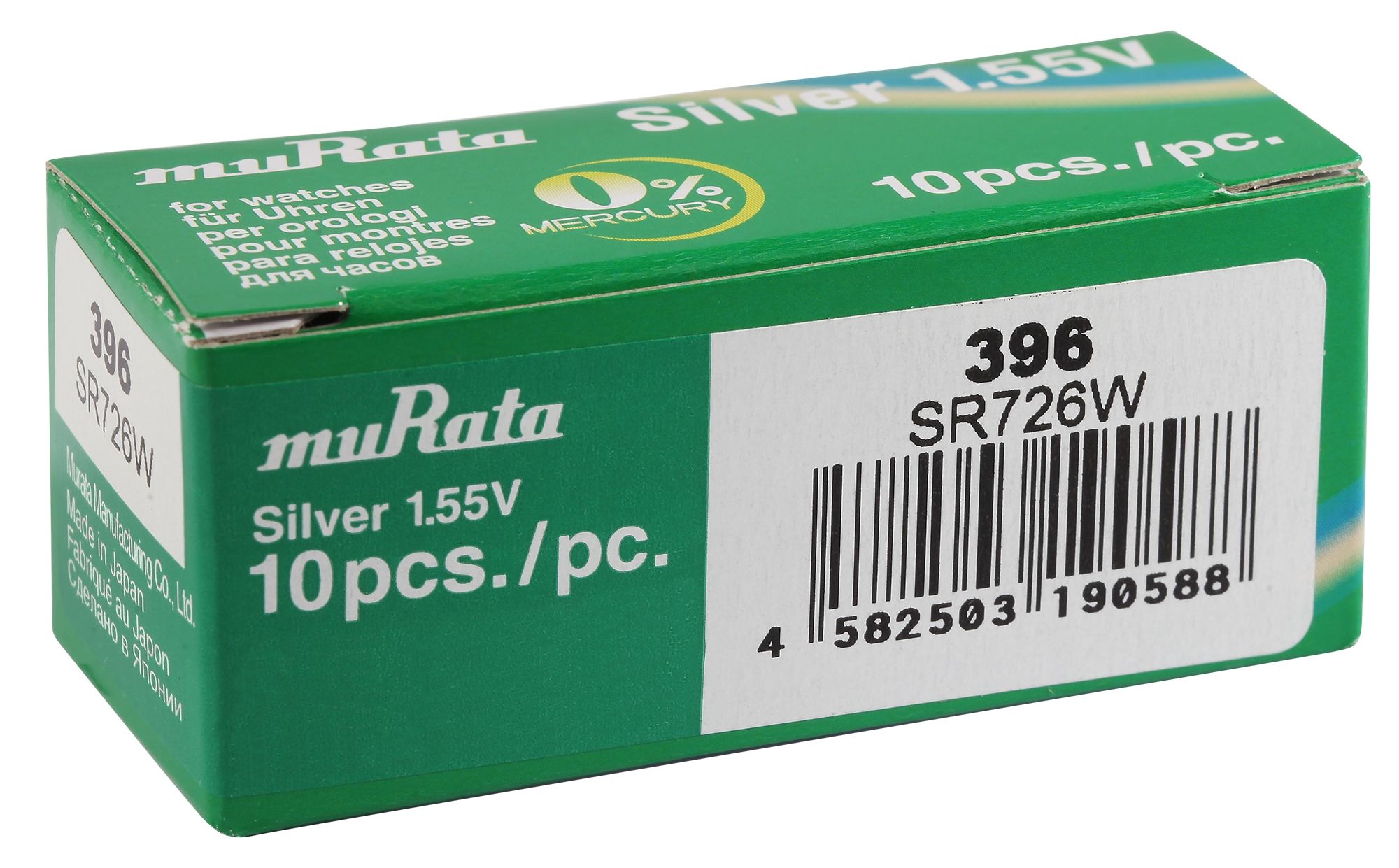 Knopfzellen Nr. 396 der Marke Murata für Uhren mit 0% Quecksilber im 10er- Blister, einzeln verpackt. Verschiedene Größen für verschiedene Uhrwerke. Die elektrische Spannung für jede Batterie beträgt 1,55 V.