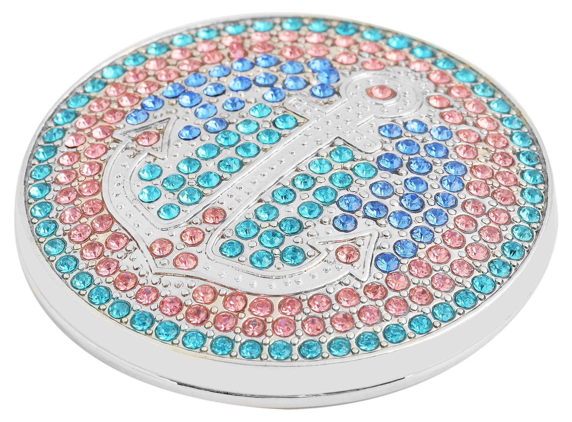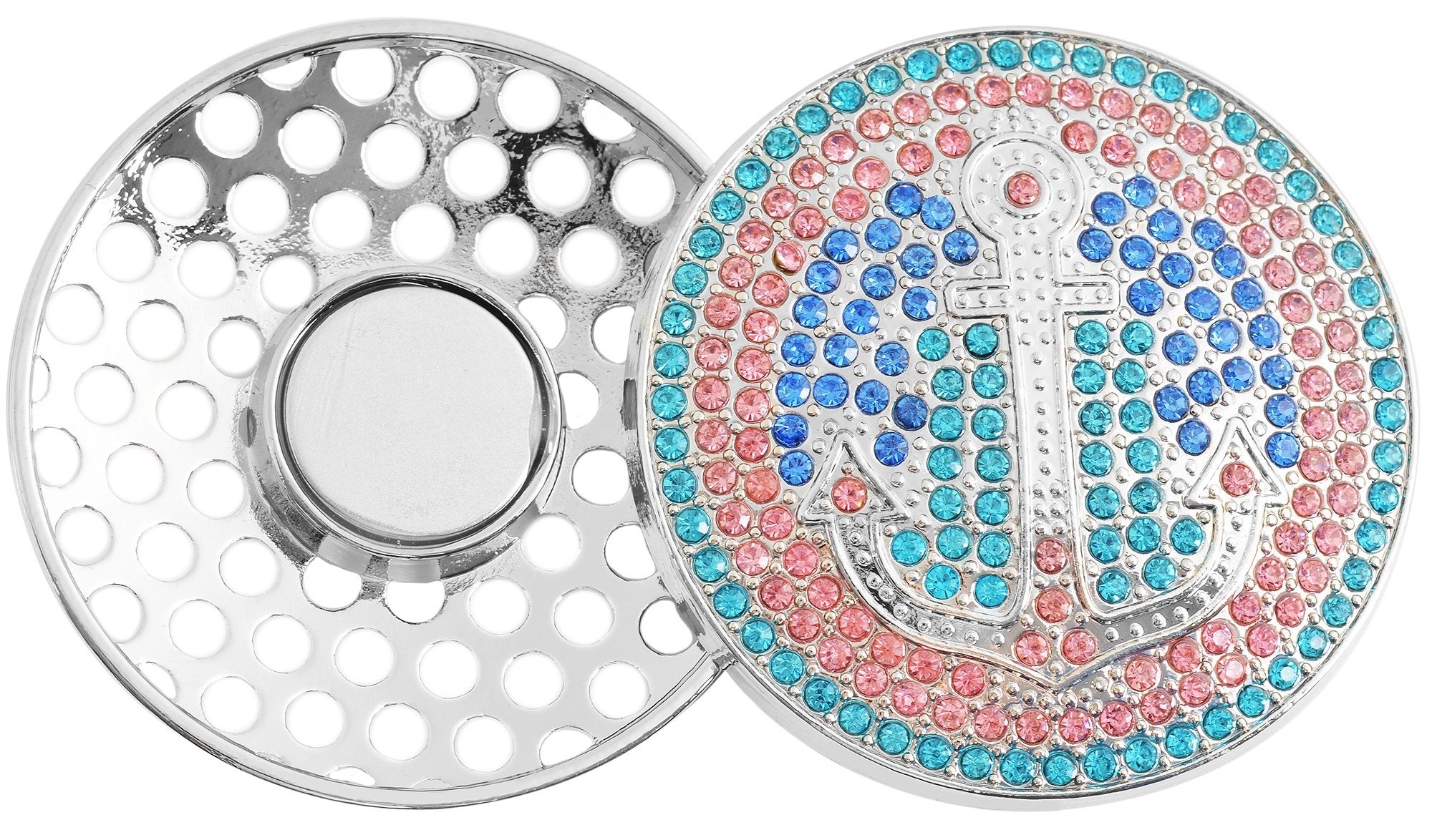 Die Oberfläche der Brosche ist silberfarbig und mit funkelnden Similisteinen in verschiedenen Mustern und Farben verziert, so dass das Accessoire zum echten Hingucker wird.