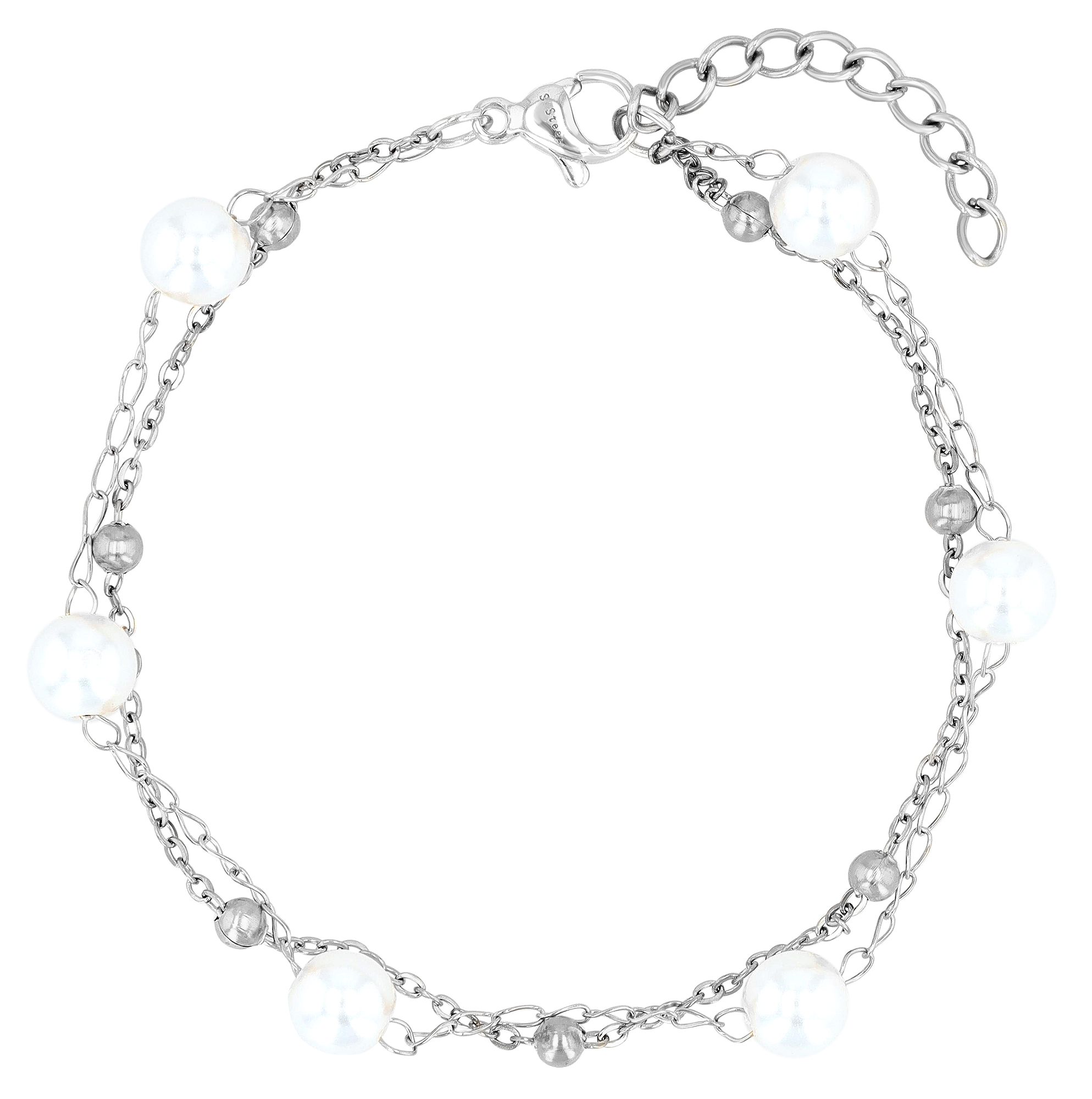 Die zwei perfekt aufeinander abgestimmten Armbänder sind zu einem Layering-Look mit nur einem Verschluss zusammengeführt. Eine Kette ist mit sechs glänzenden Glasperlen (Ø 5,5 mm) verziert, die in gleichmäßigem Abstand angeordnet sind und für einen femininen Schimmer sorgen. Die zweite Kette ist mit fünf kleineren Edelstahlkugeln (Ø 3,5 mm) versehen, die das Design perfekt abrunden.