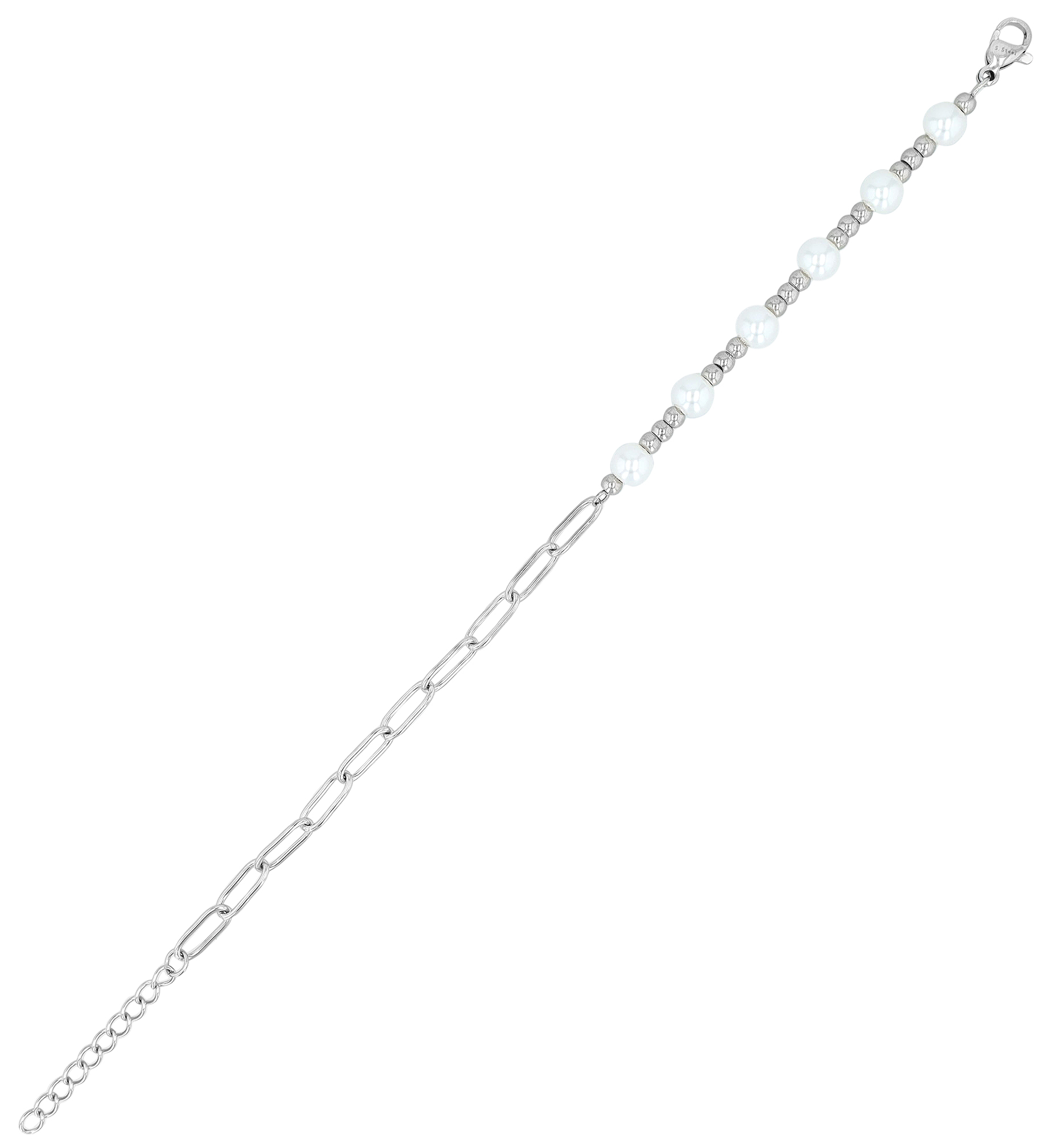 Eine Hälfte der Kette ist kunstvoll verziert mit glänzenden Glasperlen (Ø 6 mm) und kleineren Edelstahlkugeln, die in einem abwechselnden, gleichmäßigen Muster angeordnet sind. Die andere Hälfte besticht durch eine Gliederketten-Optik mit gröberen Gliedern (4 mm Breite), die dem Armband eine moderne Note verleihen. Gefertigt ist dieses Schmuckstück aus Edelstahl, was Langlebigkeit und Hautverträglichkeit gewährleistet. Mit einer Länge von 17 cm und einer zusätzlichen 3 cm Verlängerung lässt sich das Armband flexibel und perfekt an Ihr Handgelenk anpassen. Mit einem sicheren Karabinerverschluss lässt sich das Armband einfach an- und ablegen.