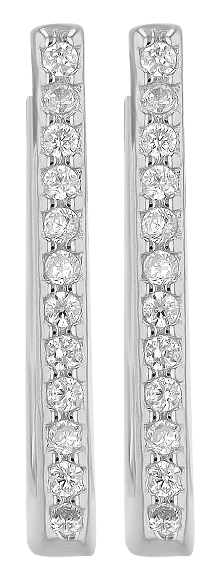 Die Vorderseite der zierlichen Ohrringe ist mit einer Reihe kleiner, klarer Zirkoniasteine besetzt, 24 an der Zahl, die für ein dezentes Funkeln sorgen. Das schlichte, flache Profil und die geometrische Form verleihen "Marielle" ein modernes Aussehen, das gut zu einem eleganten Abend im Restaurant, einer schicken Bluse im Büro oder auch Ihrem Woll-Sweater zu Hause passt.