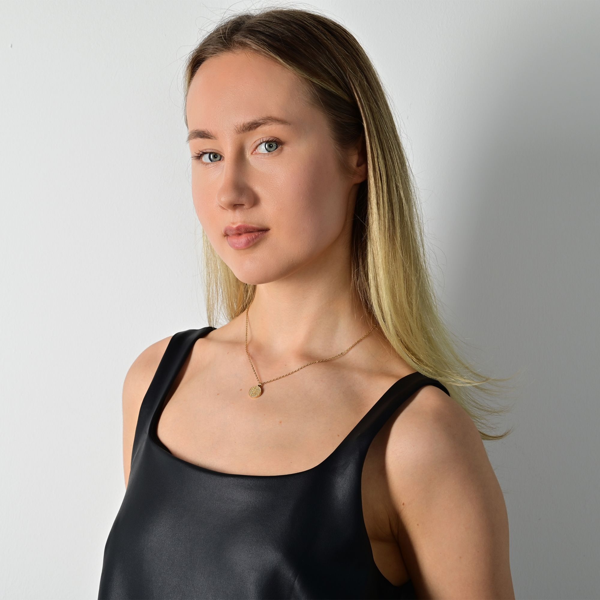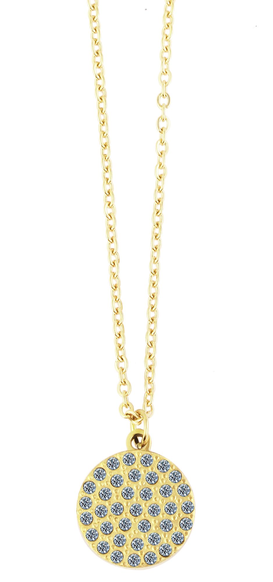 Die goldfarbene Damenkette der Marke Akzent ist im Ankermuster und aus Edelstahl gefertigt. Der kreisförmige Anhänger der mit Similisteinen verziert wird sorgt dafür, dass das Schmuckstück zum echten Hingucker wird. Die Maße der Kette ergeben sich aus einer Länge von 43 cm, einer Breite von 2 mm und einer Stärke von 1 mm. Der Anhänger hat einen Durchmesser von 12 mm und ist 2 mm stark. Öffnen und schließen lässt sich die Kette mit einem Karabinerverschluss, der ebenfalls aus Edelstahl gefertigt ist. Sowohl die Kette als auch der Anhänger sind hochglanzpoliert und IPR-beschicht, zudem kann die Rückseite des Anhängers mit kleinen Gravur versehen werden.