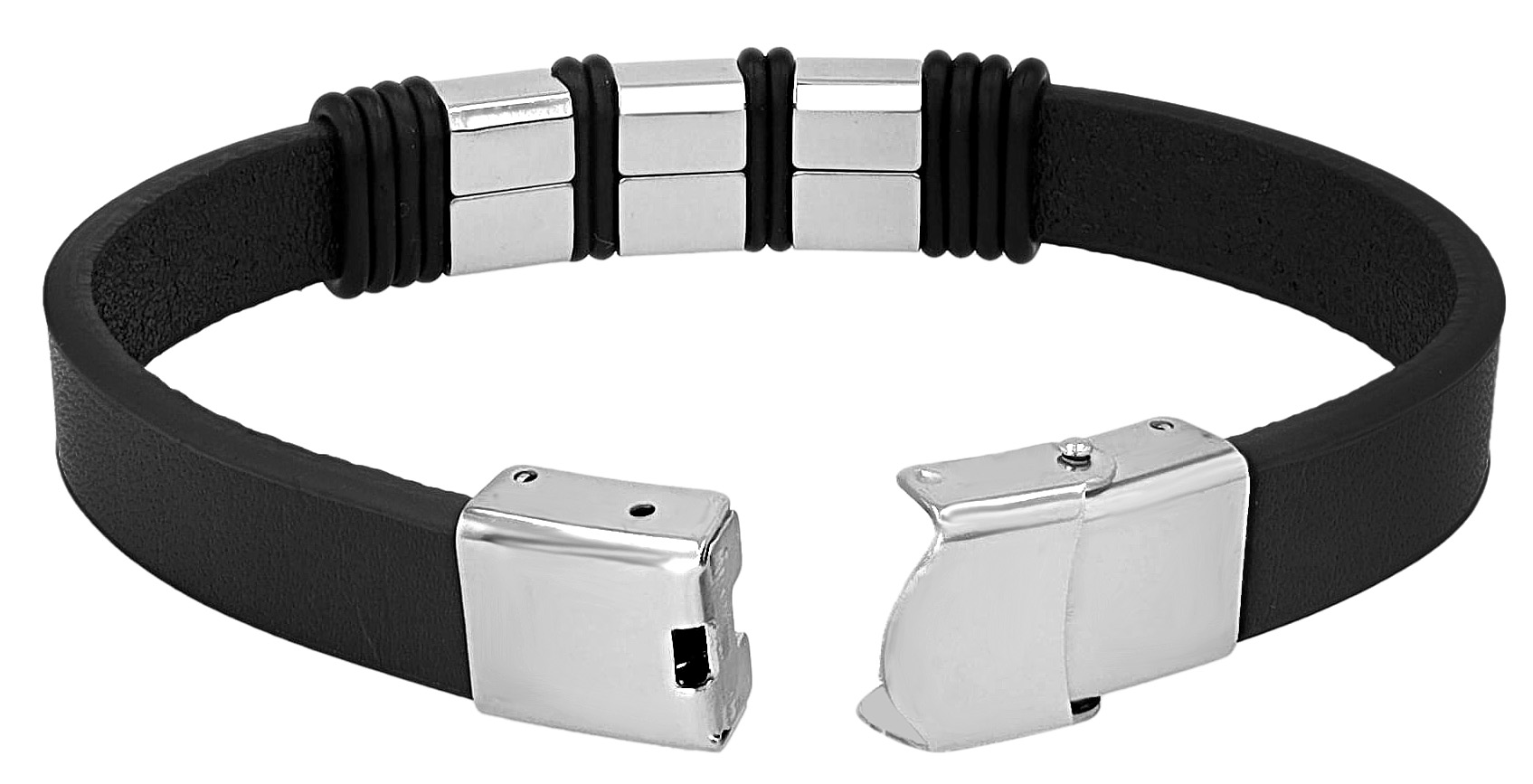 Das Echtlederarmband der Marke Akzent ist aus einem 1,3 cm breiten Lederriemen gefertigt. Dieser ist mit drei gleich großen silberfarbenen Edelstahlelementen bestückt. Diese sind mit griechischen Symbolen verziert. Die Edelstahlelemente werden durch schwarze Kautschukriemchen getrennt und gehalten. Die Gesamtlänge des Armbandes beträgt 21 cm.