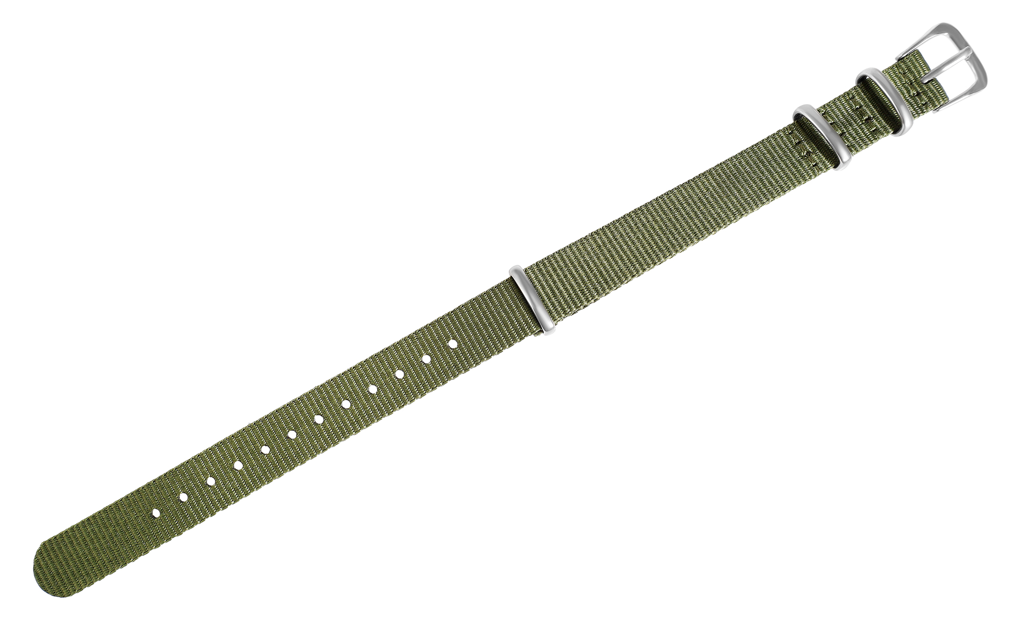 Das khakifarbene Uhrenarmband aus Nylon hat eine Anstoßbreite von 20 mm. Es lässt sich ganz einfach mit zwei handelsüblichen Federstegen am Uhrengehäuse befestigen. Das Uhrenarmband hat eine Gesamtlänge von 26,5 cm. Das Armband lässt sich über eine silberfarbene Dornschließe öffnen und schließen. Zusätzlich sind an dem Band zwei Metallschlaufen fest angenäht. Durch das weiche Material hat das Uhrenarmband einen besonders hohen Tragekomfort. Das schlichte Aussehen ermöglicht es, das Ersatzarmband an jede Art von Uhr anzubringen. Es passt sich optisch gut an das Gesamtbild der Uhren an.