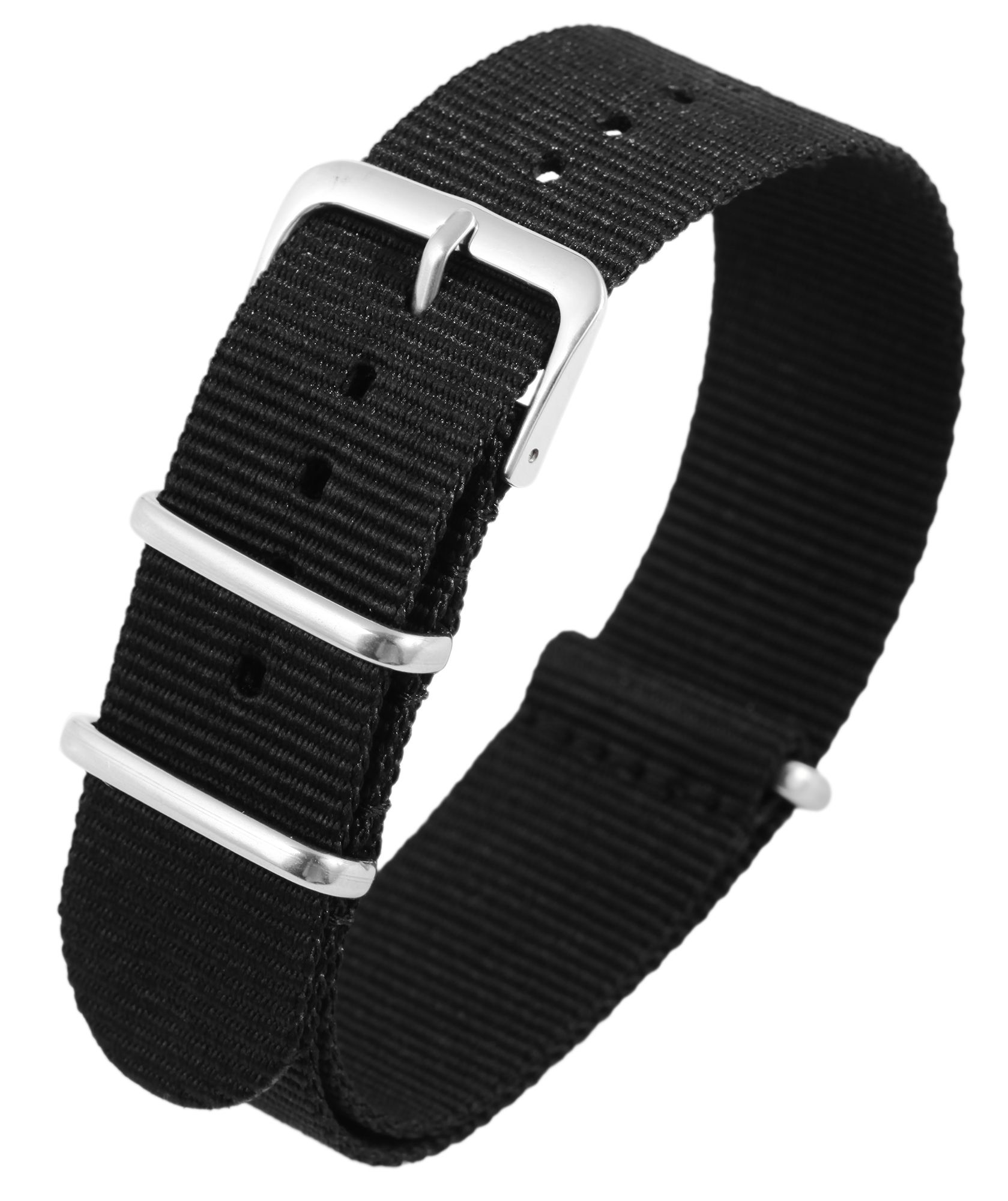 Das schwarze Uhrenarmband aus Nylon hat eine Anstoßbreite von 22 mm. Es lässt sich mit zwei handelsüblichen Federstegen am Uhrengehäuse befestigen. Das Uhrenarmband hat eine Gesamtlänge von 28 cm. Das Armband lässt sich über eine silberfarbene Dornschließe öffnen und schließen. Zusätzlich sind an dem Band zwei Metallschlaufen fest angenäht. Durch das weiche Material hat das Uhrenarmband einen besonders hohen Tragekomfort. Das schlichte Aussehen ermöglicht es, das Ersatzarmband an jede Art von Uhr anzubringen. Es passt sich optisch gut an das Gesamtbild der Uhren an.