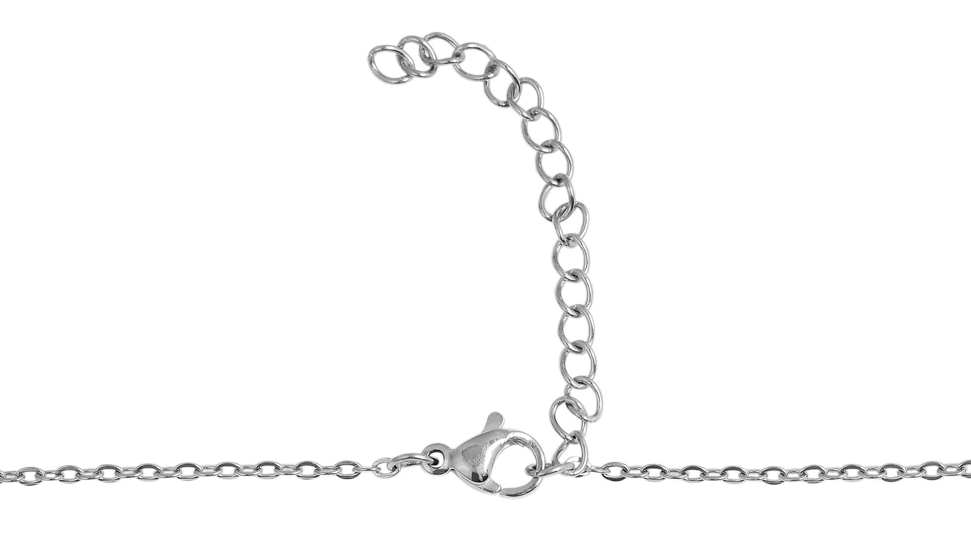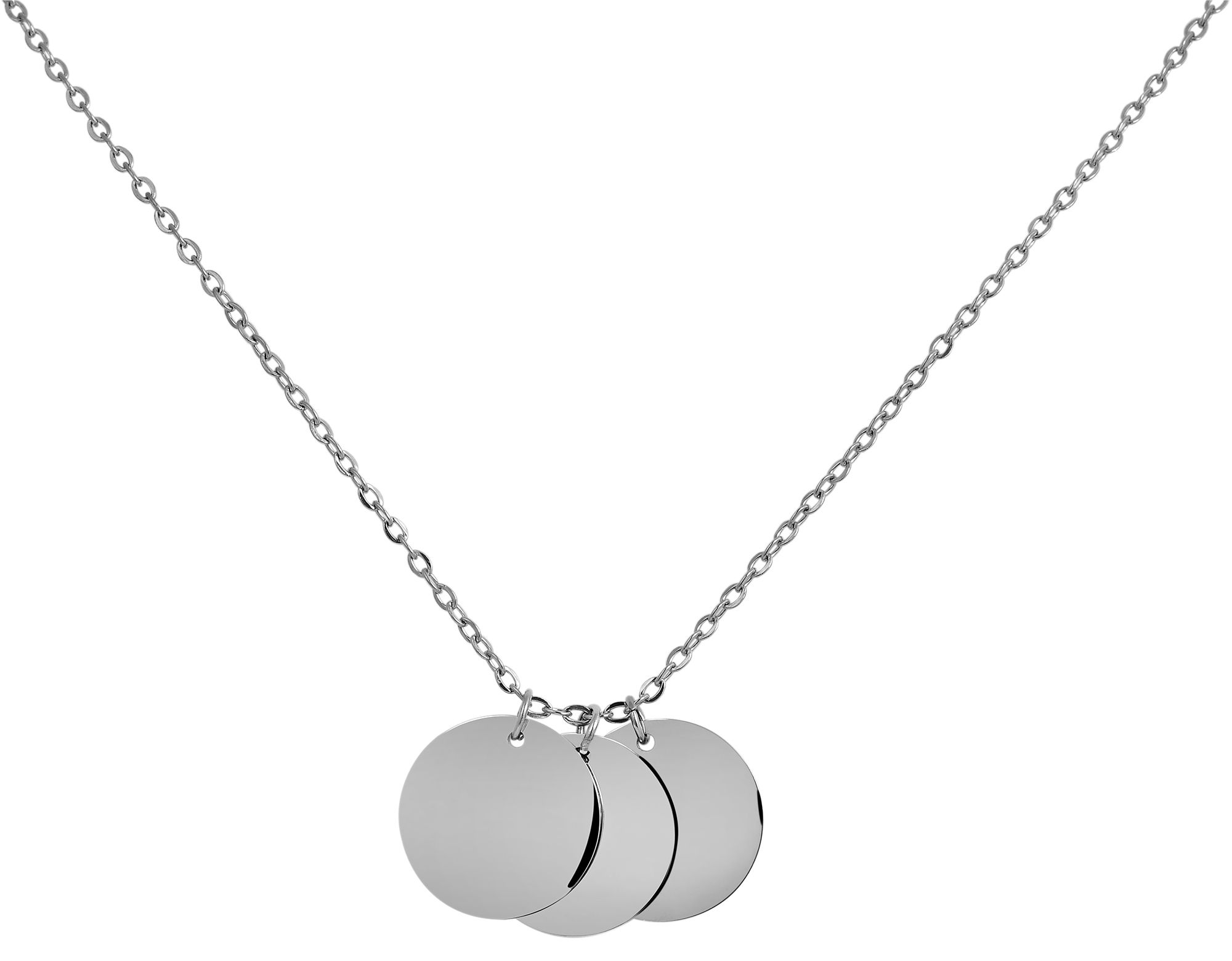 Die silberfarbene Halskette der Marke Akzent ist aus Edelstahl im Ankermuster gefertigt. Der Blickfang bei diesem Schmuckstück sind die drei runden und gravierfähigen Münzanhänger, ebenfalls in silberfarben, die einen Durchmesser von 15 mm und eine Materialstärke von 1 mm haben. Öffnen und schließen lässt sich die Kette mit einem Karabinerhaken, der ebenfalls aus Edelstahl gefertigt ist. Zusätzlich ist eine 5 cm lange Verlängerungskette an das eine Ende der Kette angebracht, die es ermöglicht, die Länge um bis zu 5 cm zu variieren und sie so an jedes Outfit anpassen zu können. Die Maße ergeben sich aus einer Länge von 45 cm und einer Stärke von 1 mm. Machen Sie dieses Accessoire mit einer individuellen Gravur zu etwas Besonderem.