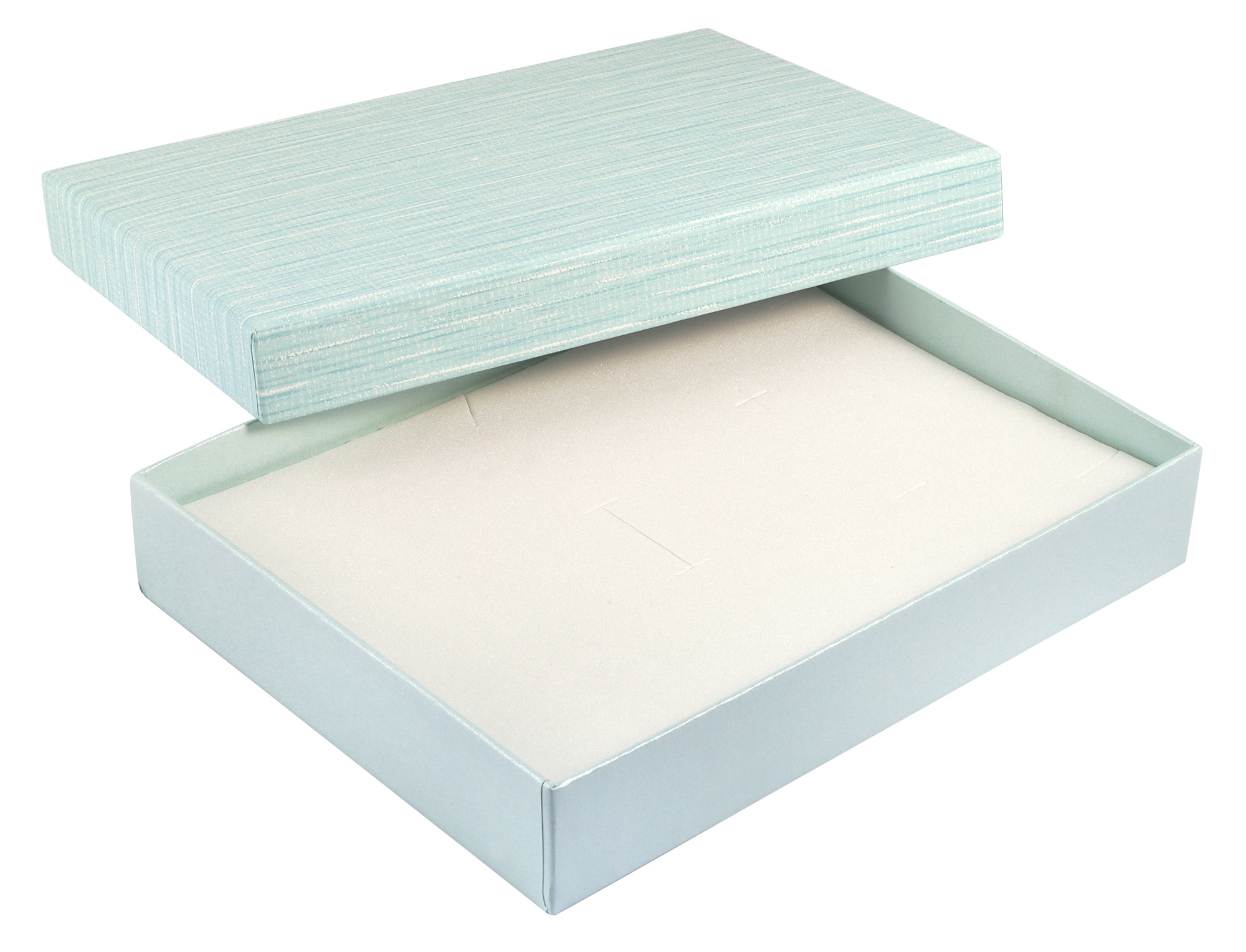 Diese bezaubernden hellblauen Schmuckschachteln in schlichtem Design sind nicht nur umweltfreundlich, sondern zugleich auch äußerst stilvoll durch ihre melierte, leicht strukturierte Oberfläche und ihre minimalistische Gestaltung. Im Inneren jeder Box befindet sich ein Schaumstoffkissen mit Polyesterbezug um Ihre kostbaren Schmuckstücke zu schützen und zu präsentieren. Erhältlich sind die Schmuckboxen in unterschiedlichen Größen und ihren entsprechenden Gebindegrößen: