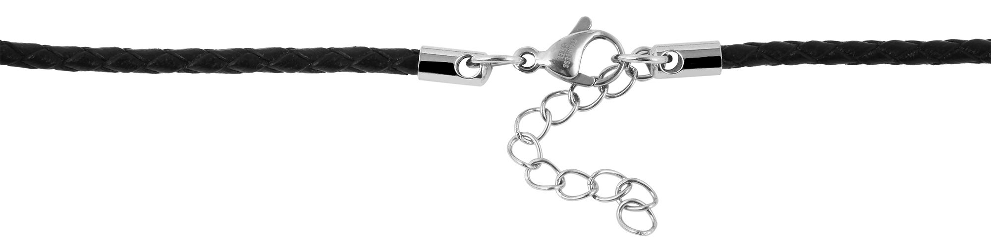 Die schwarze Halskette der Marke Akzent ist aus einem geflochtenen Echtlederriemen gefertigt. Diese hat eine Länge von 50 cm und eine Stärke von 3 mm. Öffnen und schließen lässt sie sich mit einem silberfarbenen Karabinerhaken, der aus Edelstahl gefertigt ist. Zusätzlich ist an das eine Ende der Kette eine 5 cm lange Verlängerungskette angebracht. Das ermöglicht es um bis zu 5 cm in der Länge zu variieren und das Schmuckstück jedem beliebigen Outfit anpassen zu können. Eine schlichte Halskette, die auch mit einem Kettenanhänger getragen werden kann.