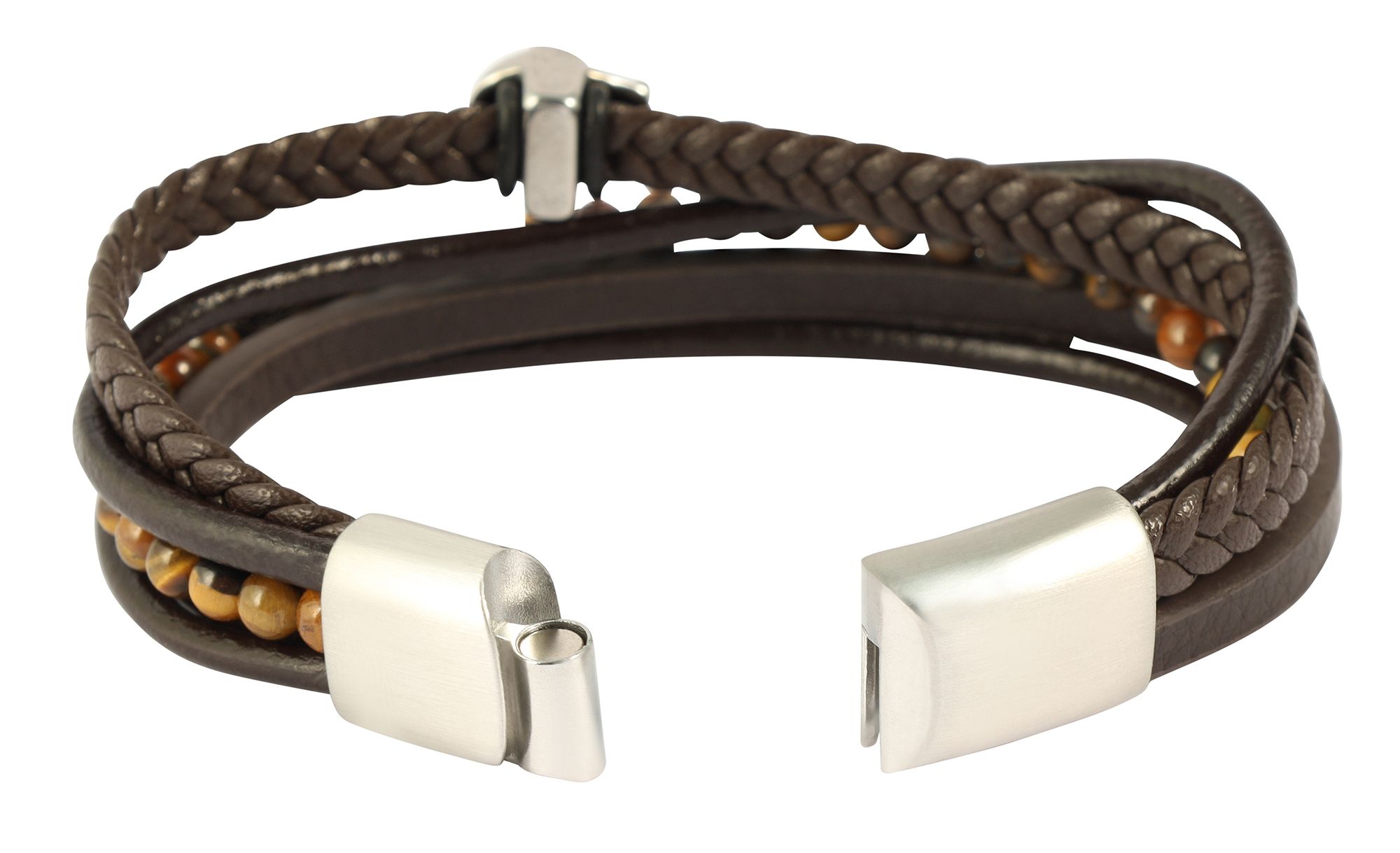 Das "Perry" Armband zeichnet sich durch seine abwechslungsreiche Struktur aus, die durch die Kombination unterschiedlicher Texturen des Lederimitats entsteht. Die warmen, erdigen Töne der braunen Tigeraugen-Perlen verleihen dem Armband eine natürliche Eleganz, während der auffällige Edelstahlanhänger in Totenkopfform dem Design einen rebellischen Touch verleiht.