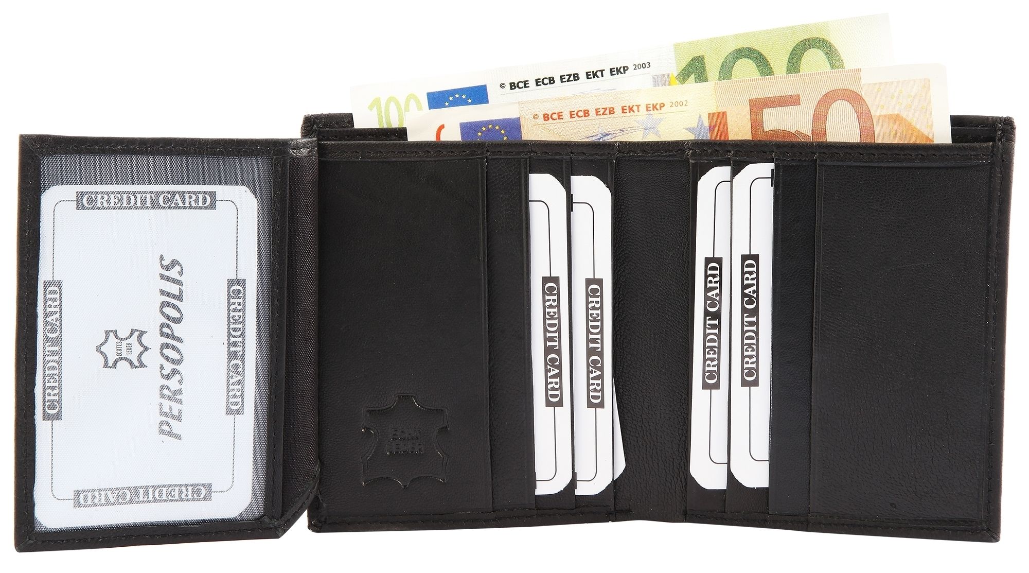 Die Geldbörse der Marke Persopolis wurde im Hochformat aus echtem Schafsleder gefertigt und hat eine glatte Oberfläche. Die Geldbörse bietet viel Stauraum für alle wichtigen Dokumente und Karten. Aufgeteilt ist die Börse in neun Kreditkartenfächer, zwei Geldscheinfächer, zwei Einsteckfächer und ein Ausweisfach. Die Maße der Geldbörse ergeben sich aus einer Länge von 11,1 cm, einer Breite von 9,2 cm und einer Höhe von 2,2 cm. Das Ausweisfach des Portemonnaies ist mit einer durchsichtigen Folie ausgestattet. Die Geldbörse ist schwarz.
