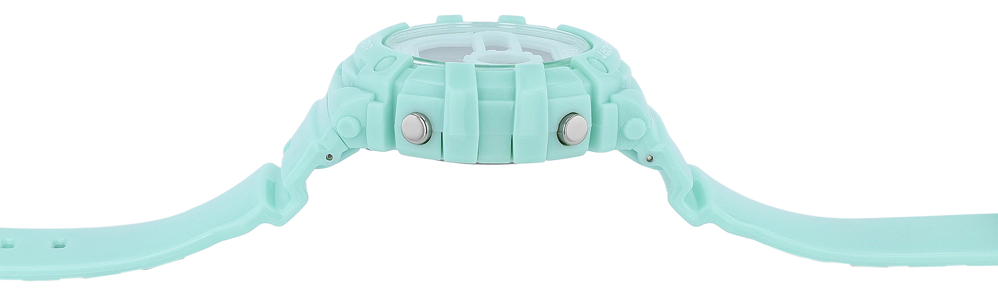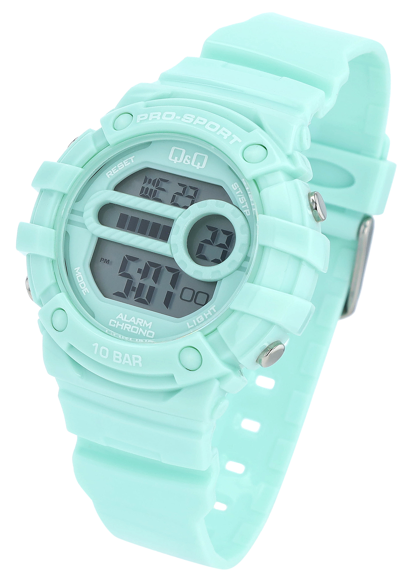Das Gehäuse dieser Sportuhr besteht aus robustem Kunststoff, hat einen Durchmesser von 40,5 mm und eine Gehäusehöhe von 14,5 mm und ist in drei attraktiven Pastellfarben erhältlich. Akzente setzen zwei metallene Drücker auf der linken und rechten Seite des Gehäuses, die eine intuitive Bedienung der verschiedenen Funktionen ermöglichen. Das Silikonarmband in der passenden Farbe bietet einen besonders hohen Tragekomfort und besitzt am Steg eine Bandbreite von 22,5 mm. Die Gesamtlänge der Uhr inklusive Armband beträgt 21 cm. Mit einer Wasserdichtigkeit von 10 Bar ist diese Uhr bestens für sportliche Aktivitäten im und am Wasser geeignet.