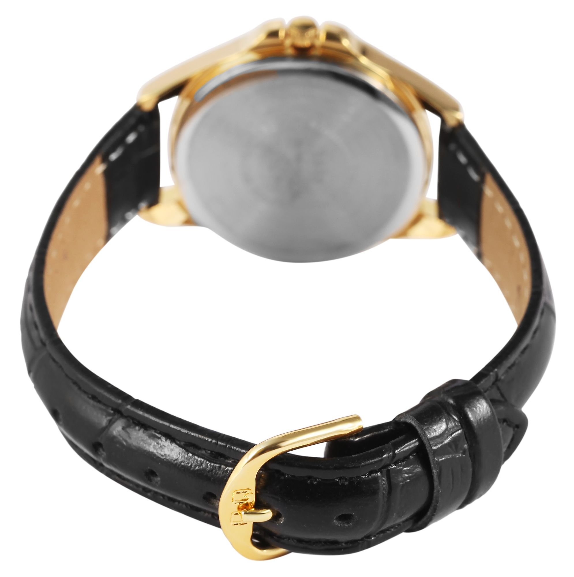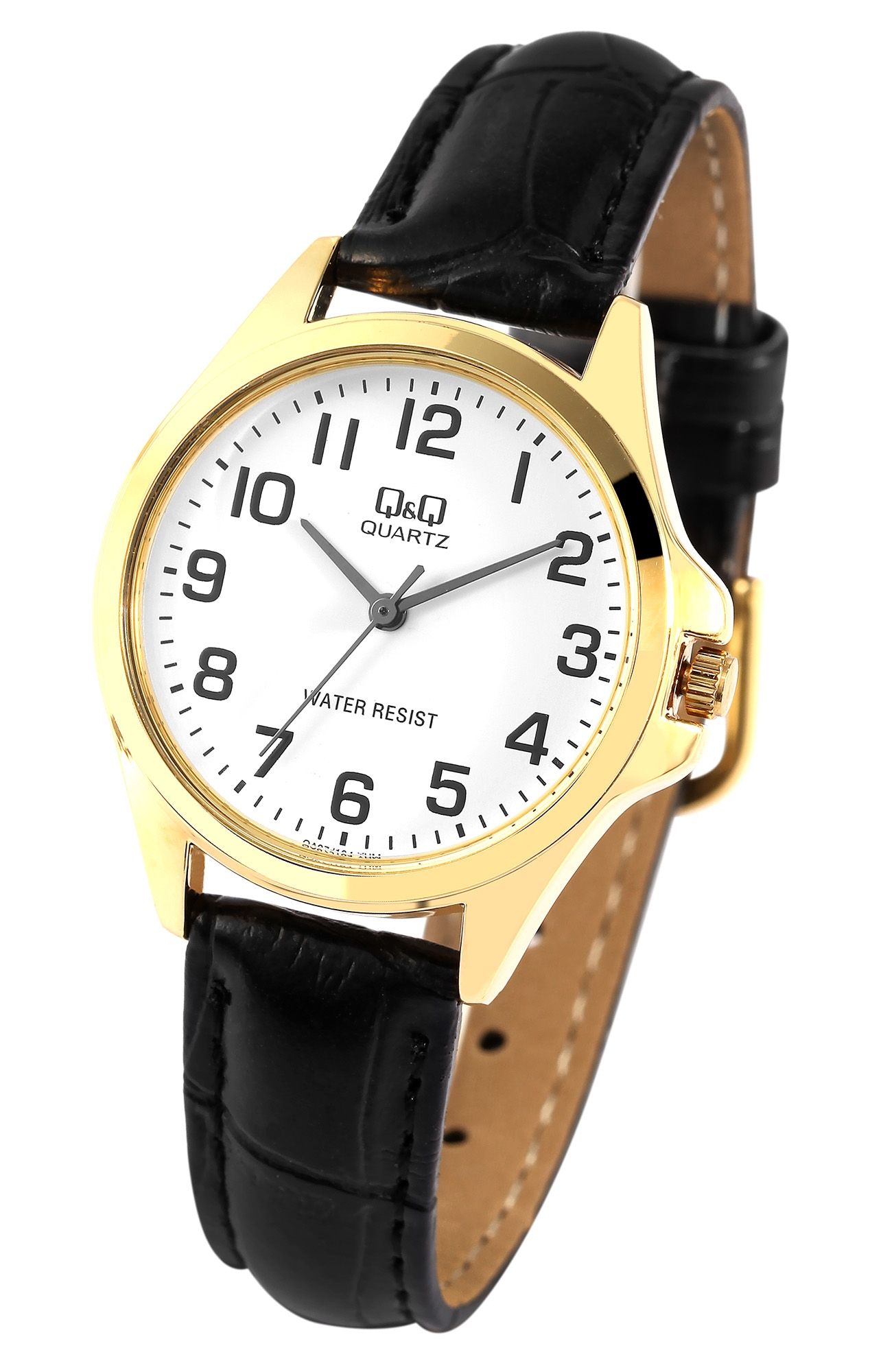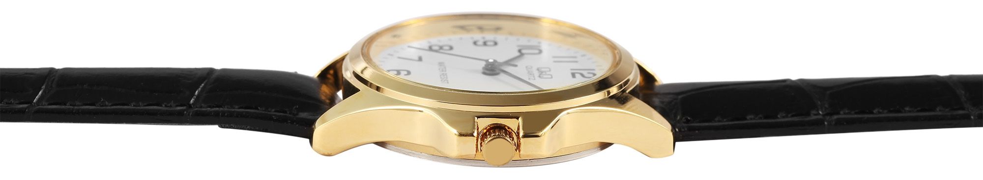 Die analoge 3-Zeiger Damenarmbanduhr der Marke Q&Q - by Citizen Watch Co. LTD verfügt über ein hochwertiges Quarzuhrwerk. Das schwarze Lederimitatarmband mit Krokoprägung ist am Anstoß 14 mm breit und lässt sich mit einer silberfarbenen Dornschließe öffnen und schließen. Die Gesamtlänge der Uhr beträgt 22 cm. Das goldfarbene Metallgehäuse mit Mineralglas hat eine Abmessung von 30 mm im Durchmesser und einer Gehäusehöhe von 8 mm. Der Gehäuseboden ist aus Edelstahl gefertigt. Das Zifferblatt ist weiß und mit schwarzen Ziffern bedruckt. Die Zeiger sind silberfarbig. Zudem hat die Uhr eine Wasserdichtigkeit von 3 bar.