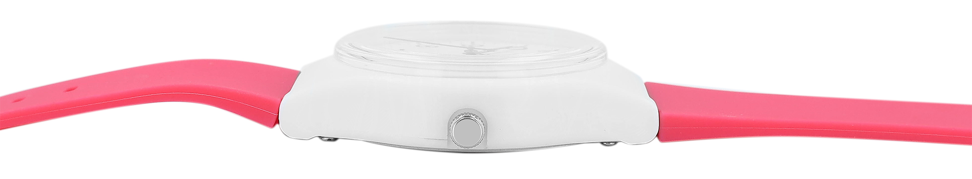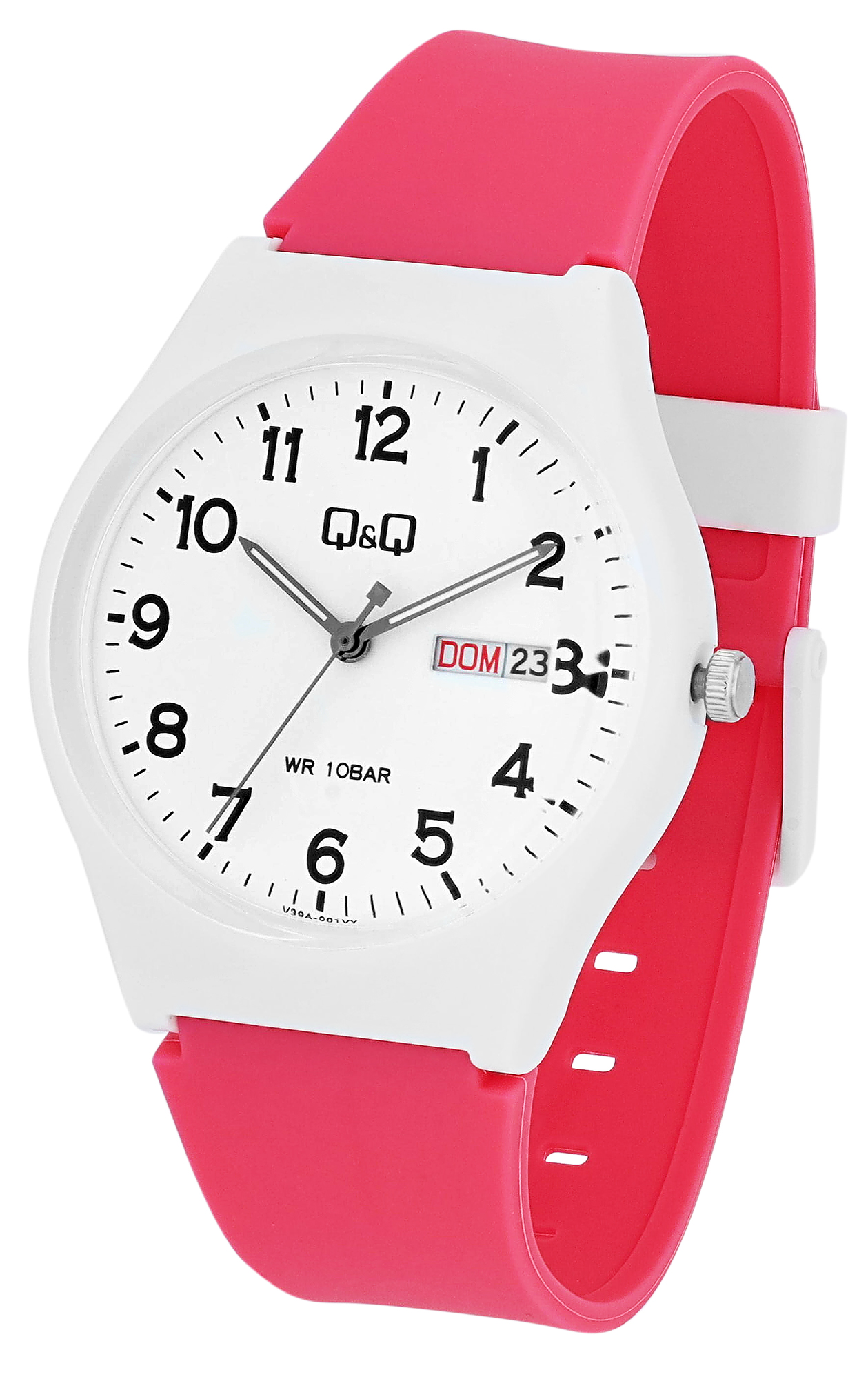 Die analoge 3-Zeiger Armbanduhr der Marke Q&Q - by Citizen Watch Co. LTD verfügt über ein hochwertiges Quarzuhrwerk. Das pinkfarbene Silikonarmband ist am Anstoß 22 mm breit und lässt sich mit einer weißen Dornschließe öffnen und schließen. Die Gesamtlänge der Uhr beträgt 24,5 cm. Das weiße Kunststoffgehäuse hat einen Durchmesser von 40 mm und eine Gehäusehöhe von 12 mm. Der Gehäuseboden ist aus Edelstahl gefertigt. Das Zifferblatt ist weiß und die Zeiger und Indexe sind schwarz. Durch den farblichen Kontrast lässt sich die Uhrzeit einfach ablesen. Zudem verfügt die Uhr über eine Tages- und Datumsanzeige auf drei Uhr und einer Wasserdichtigkeit von 10 bar.