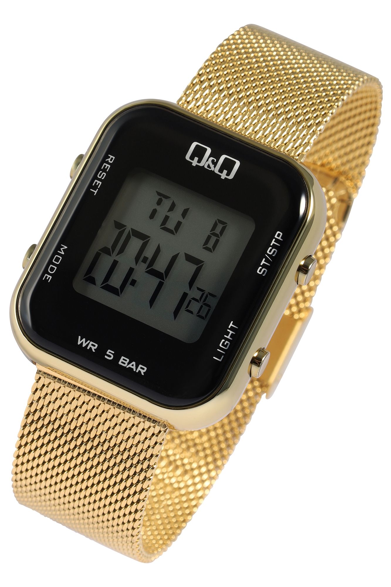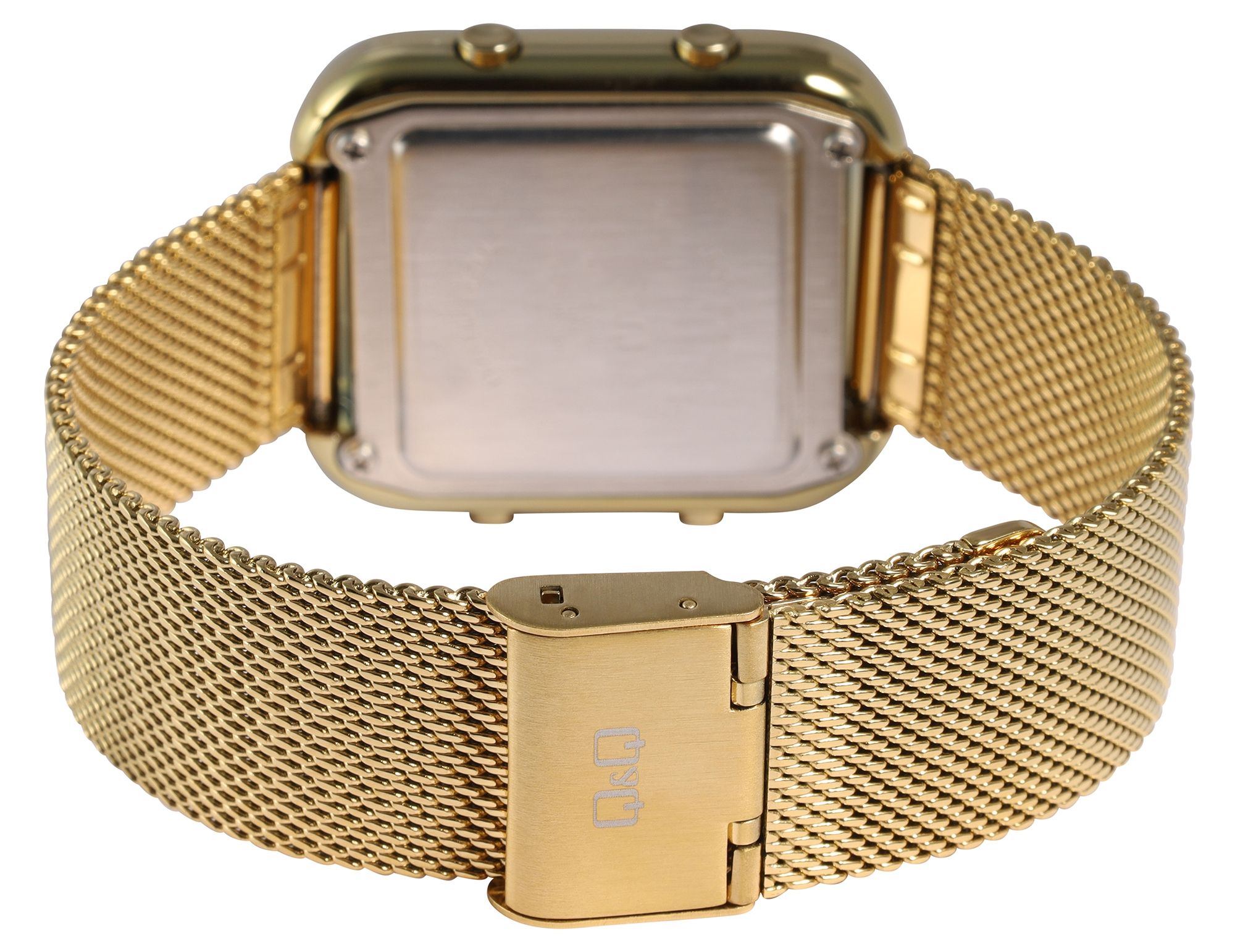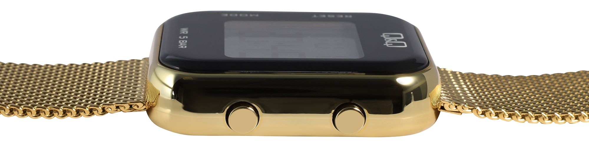 Diese vielseitige Q&Q - by Citizen Watch Co. LTD Digitaluhr für Damen ist nicht nur schön anzusehen durch das stabile goldfarbene Kunststoffgehäuse mit Edelstahlboden und das ebenfalls goldfarbene Meshband mit Faltschließe, sondern auch bis zu 50 Meter Tiefe wasserdicht und für vielfältige sportliche Aktivitäten von Vorteil mit der eingebauten Stoppuhr.