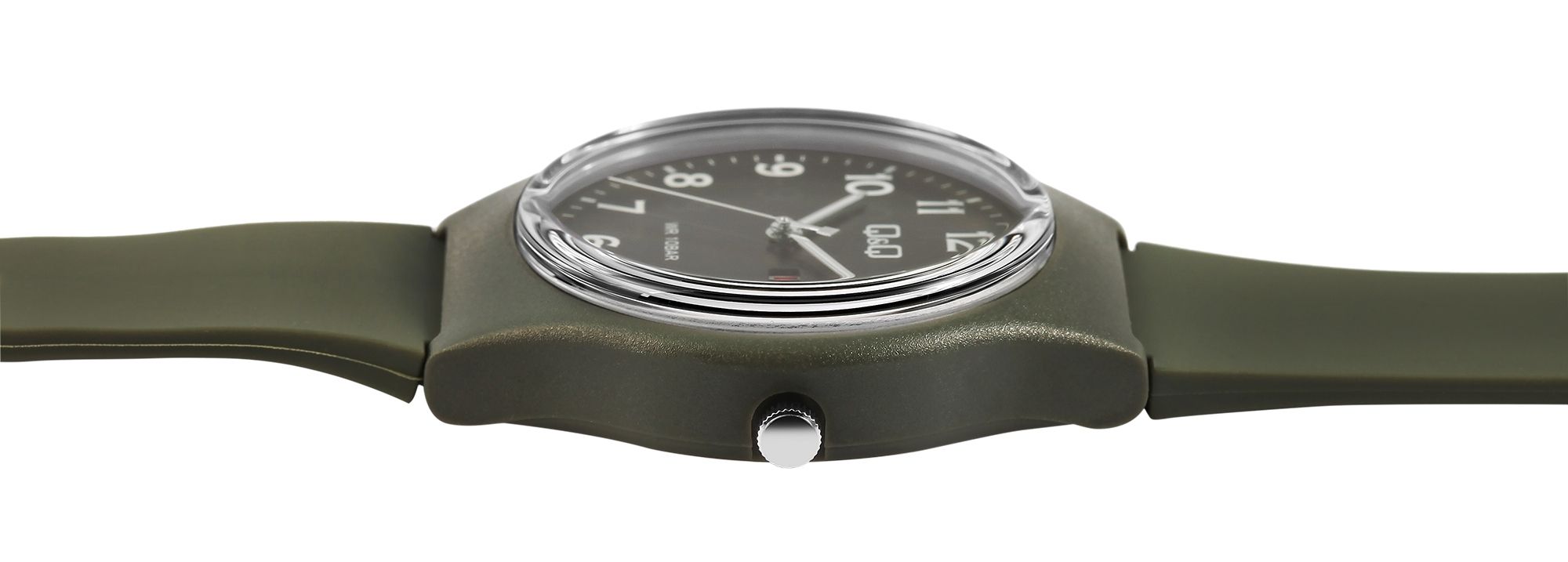 Diese Q&Q - by Citizen Watch Co. LTD Uhr kommt mit einem leichten und extrem widerstandsfähigen Kunststoffgehäuse Ø 38 mm und einem kratzfesten Kunststoffglas. Für Tragekomfort sorgt das flexible und langlebige Silikonarmband 21 mm breit, konisch zulaufend, Gesamtlänge 25 cm, das dank der Dornschließe immer perfekt sitzt.