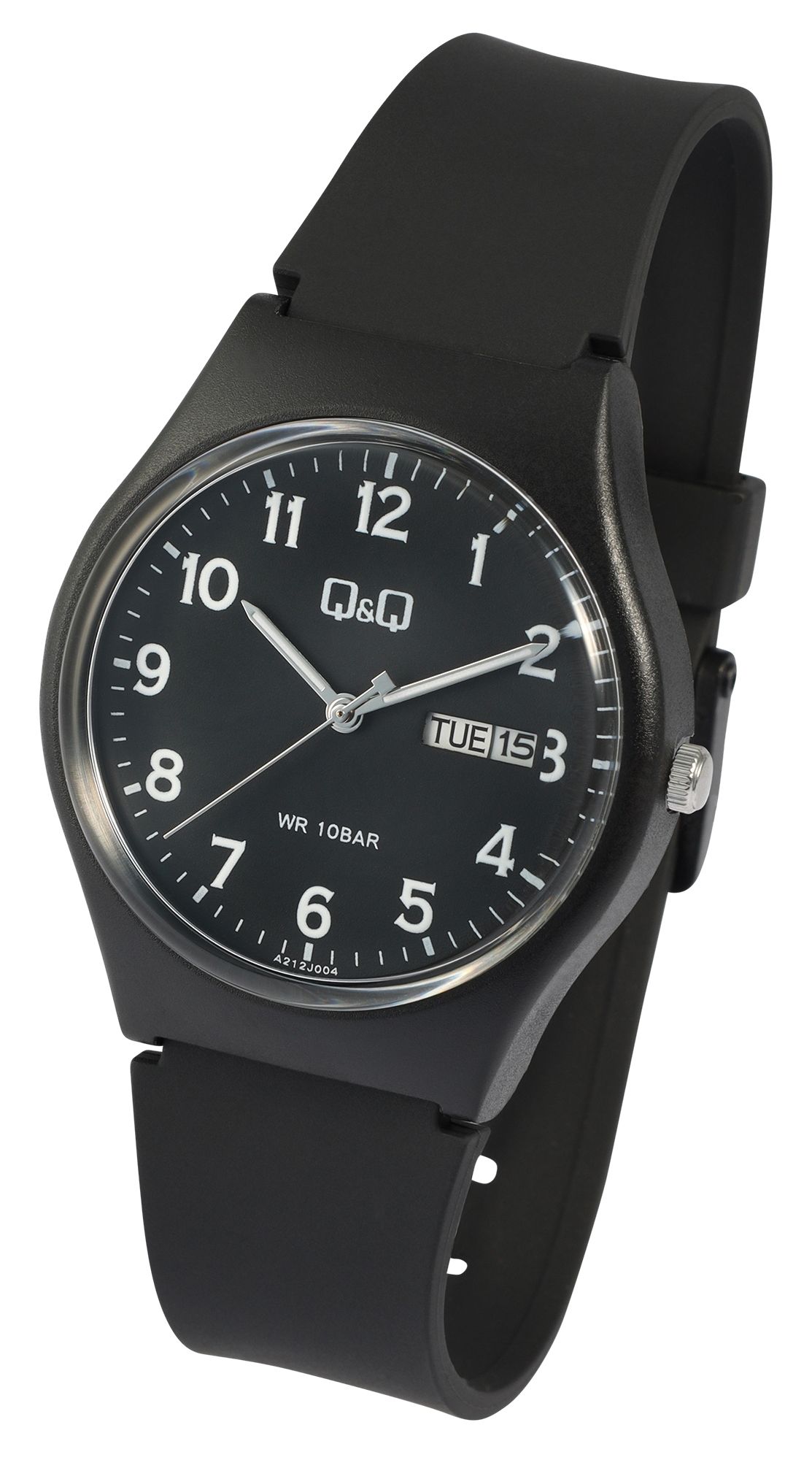 Diese Q&Q - by Citizen Watch Co. LTD Uhr kommt mit einem leichten und extrem widerstandsfähigen Kunststoffgehäuse Ø 38 mm und einem kratzfesten Kunststoffglas. Für Tragekomfort sorgt das flexible und langlebige Silikonarmband 21 mm breit, konisch zulaufend, Gesamtlänge 25 cm, das dank der Dornschließe immer perfekt sitzt.