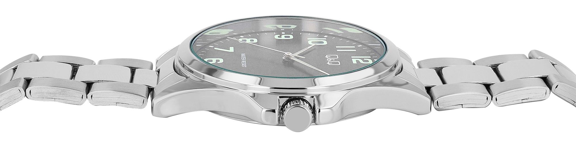 Die Q&Q Herrenuhr mit Gliederarmband aus Edelstahl verkörpert zeitlose Eleganz, Präzision und Funktionalität in einem schicken Gewand. Mit ihrem klassisch gestalteten Zifferblatt und klaren, schwarzen arabischen Ziffern ist diese Uhr der stilvolle Begleiter für jede Gelegenheit.