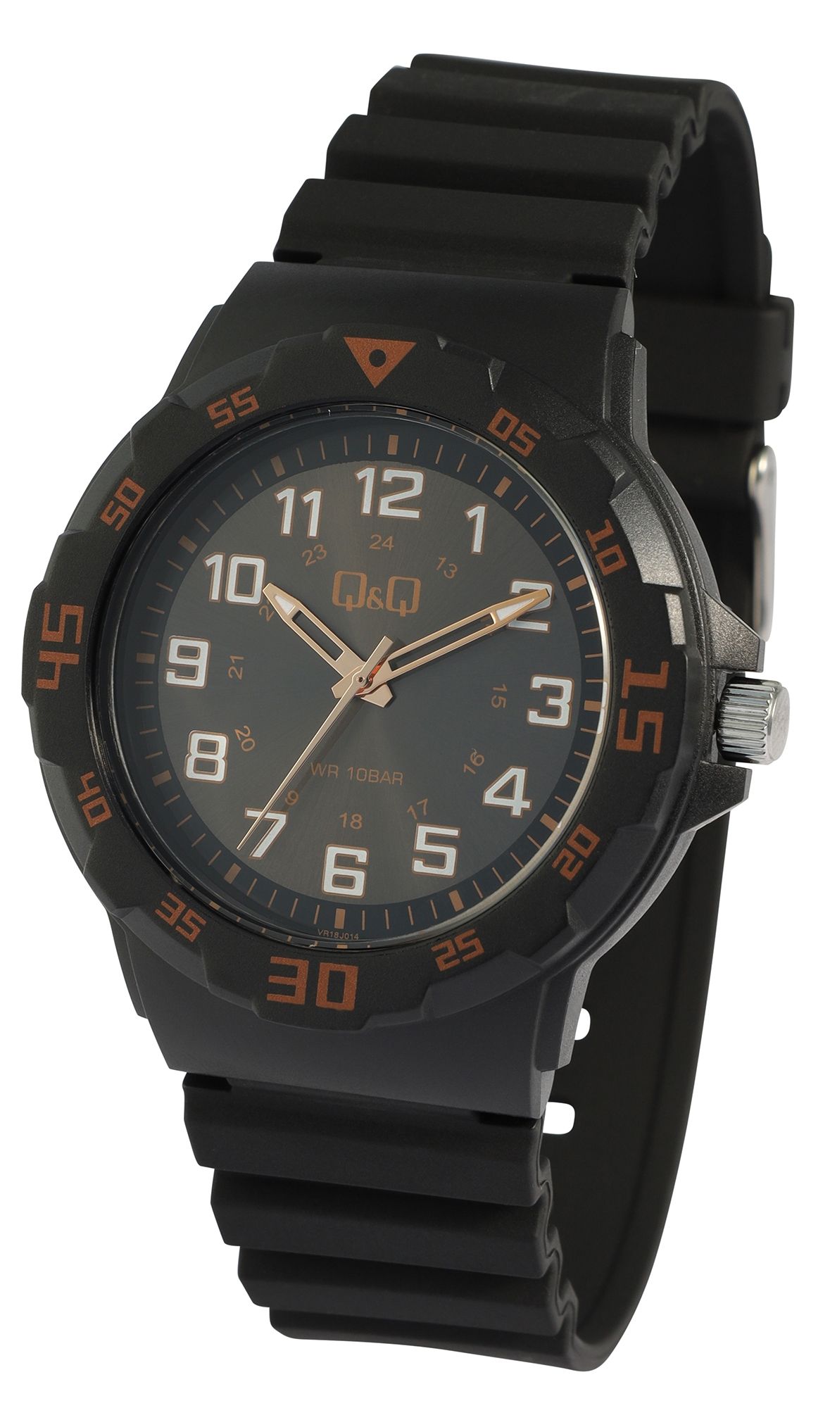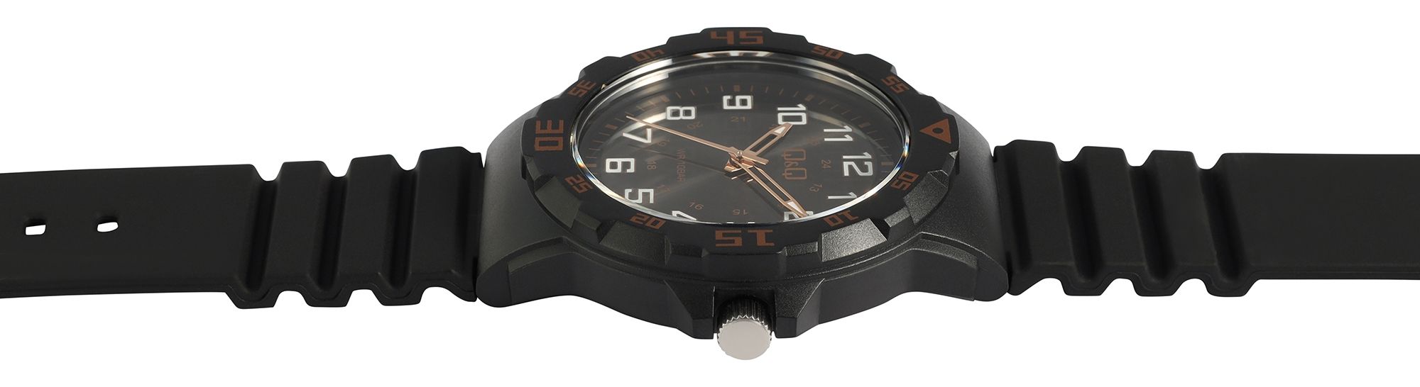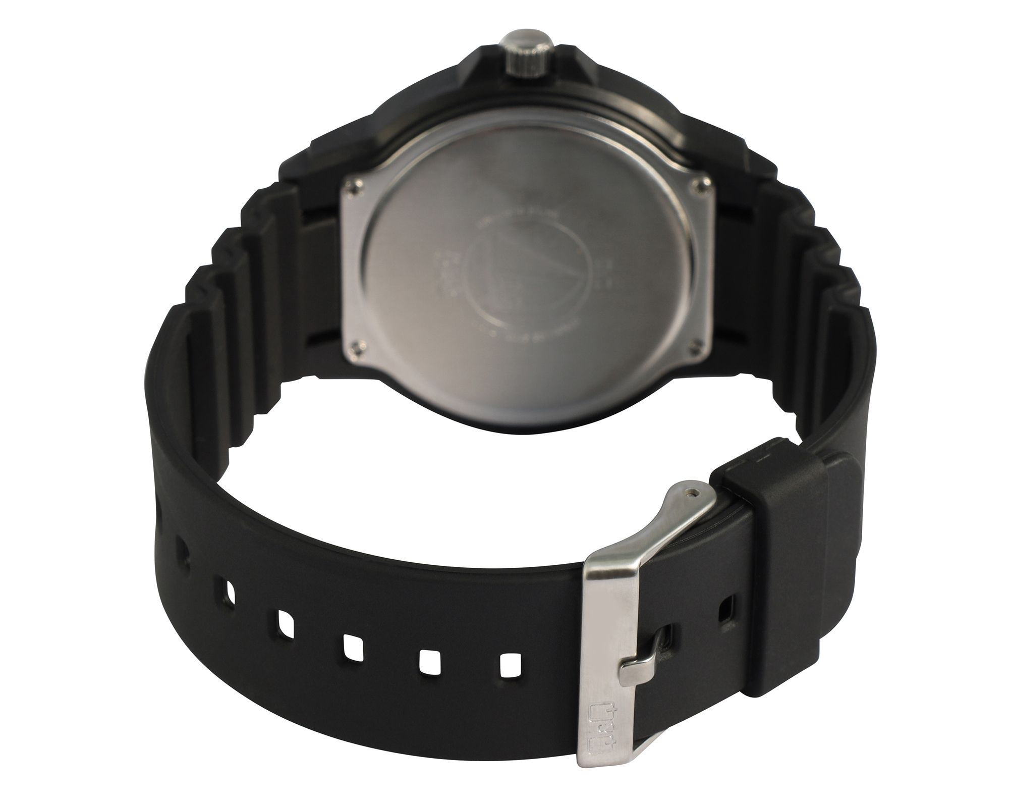 Die analoge 3-Zeiger Herrenarmbanduhr der Marke Q&Q - by Citizen Watch Co. LTD (by Citizen Watch & Co., LTD) verfügt über ein hochwertiges Quarzuhrwerk, das für eine zuverlässige Zeitanzeige sorgt. Das schwarze Silikonarmband ist am Steg 22 mm breit (Bandbreite am 20 mm) und lässt sich mit einer silberfarbenen Dornschließe aus Edelstahl öffnen und schließen. Die Gesamtlänge der Uhr beträgt 25 cm. Das schwarze Kunststoffgehäuse mit Kunststoffglas hat einen Durchmesser von 43 mm und eine Gehäusehöhe von 11 mm. Der Gehäuseboden ist aus Edelstahl gefertigt und zudem hat die Uhr eine Wasserdichtigkeit von 10 bar.