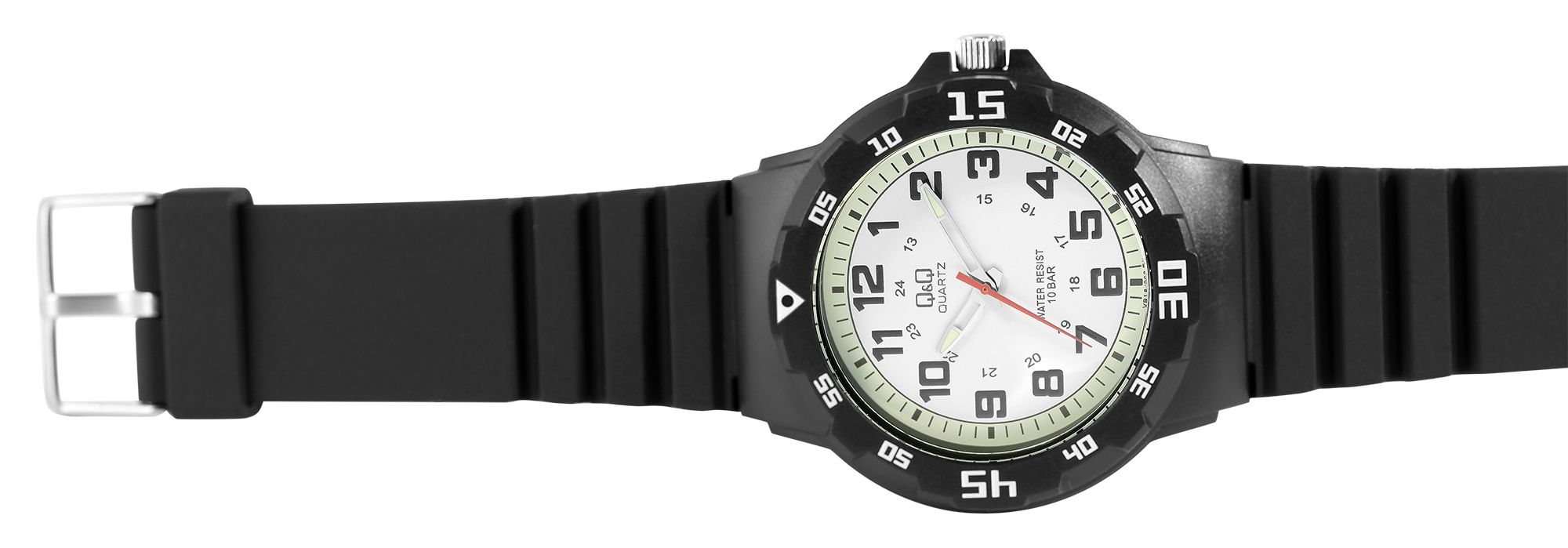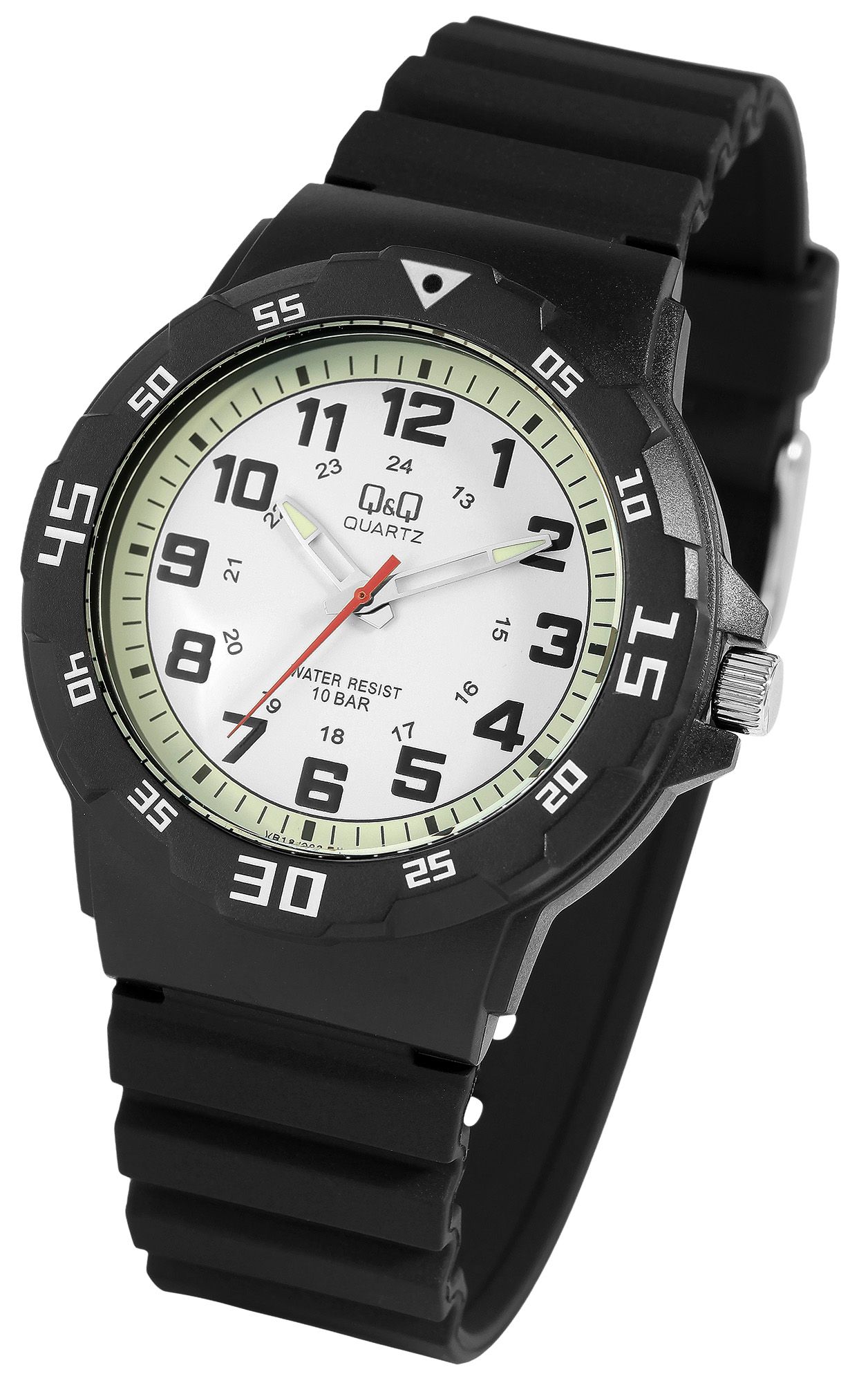 Die analoge 3-Zeiger Herrenarmbanduhr der Marke Q&Q - by Citizen Watch Co. LTD (by Citizen Watch Co. LTD) verfügt über ein hochwertiges Quarzuhrwerk. Das schwarze Silikonarmband ist am Steg 22 mm breit (Bandbreite 20 mm) und lässt sich mit einer silberfarbenen Dornschließe öffnen und schließen. Die Gesamtlänge der Uhr beträgt 25 cm. Das schwarze Kunststoffgehäuse mit Kunststoffglas hat einen Durchmesser von 43 mm und eine Gehäusehöhe von 11 mm. Der Gehäuseboden ist aus Edelstahl gefertigt. Durch die mit Superluminova beschichteten Zeiger lässt sich auch im Dunkeln die Zeit gut ablesen. Die Uhr hat eine Wasserdichtigkeit von 10 bar.