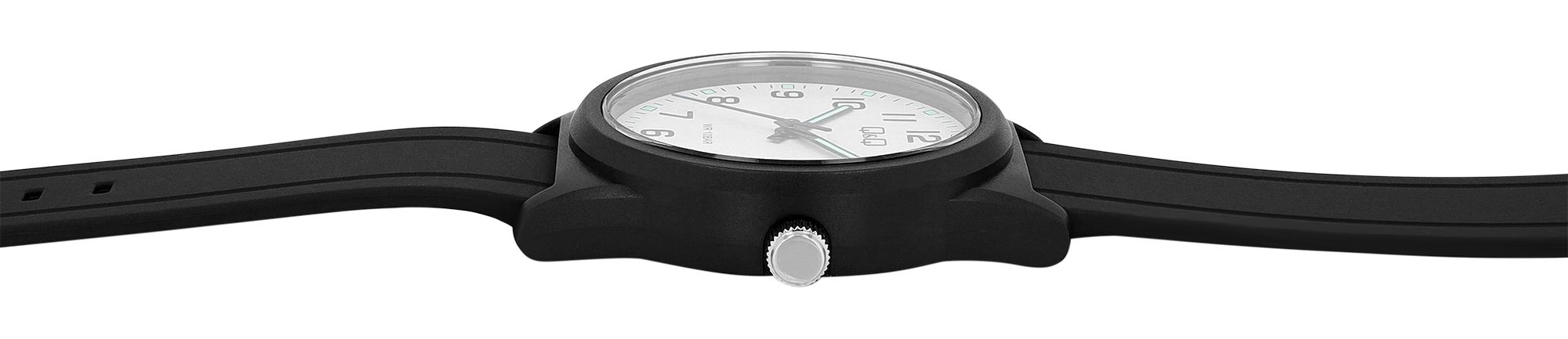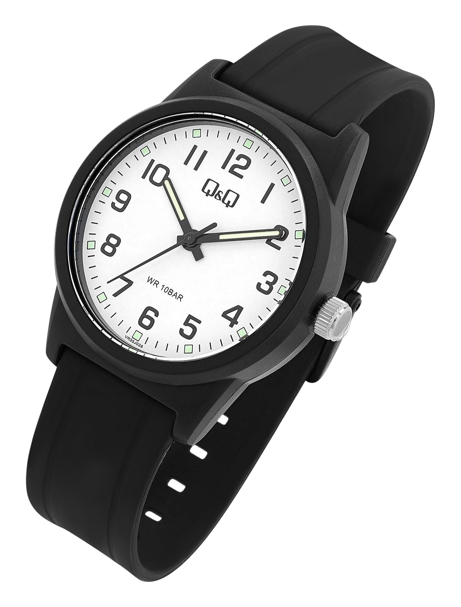 Verleihen Sie Ihrem Uhrensortiment das gewisse Etwas und setzen Sie auf die Kombination aus Qualität und Stil, die Q&Q - by Citizen Watch Co. LTD (by Citizen Watch Co. LTD) verkörpert. Im Inneren dieser analogen Armbanduhr schlägt ein hochwertiges Quarzuhrwerk, das für präzise Zeitmessung und jahrelange Zuverlässigkeit sorgt. Das matte schwarze Silikonarmband fühlt sich angenehm an und bietet den ganzen Tag über Tragekomfort. Dies ist eine Uhr, die problemlos mit unterschiedlichen Stilen kombiniert werden kann und in allen Situationen des Lebens als treuer Zeitmesser dient.