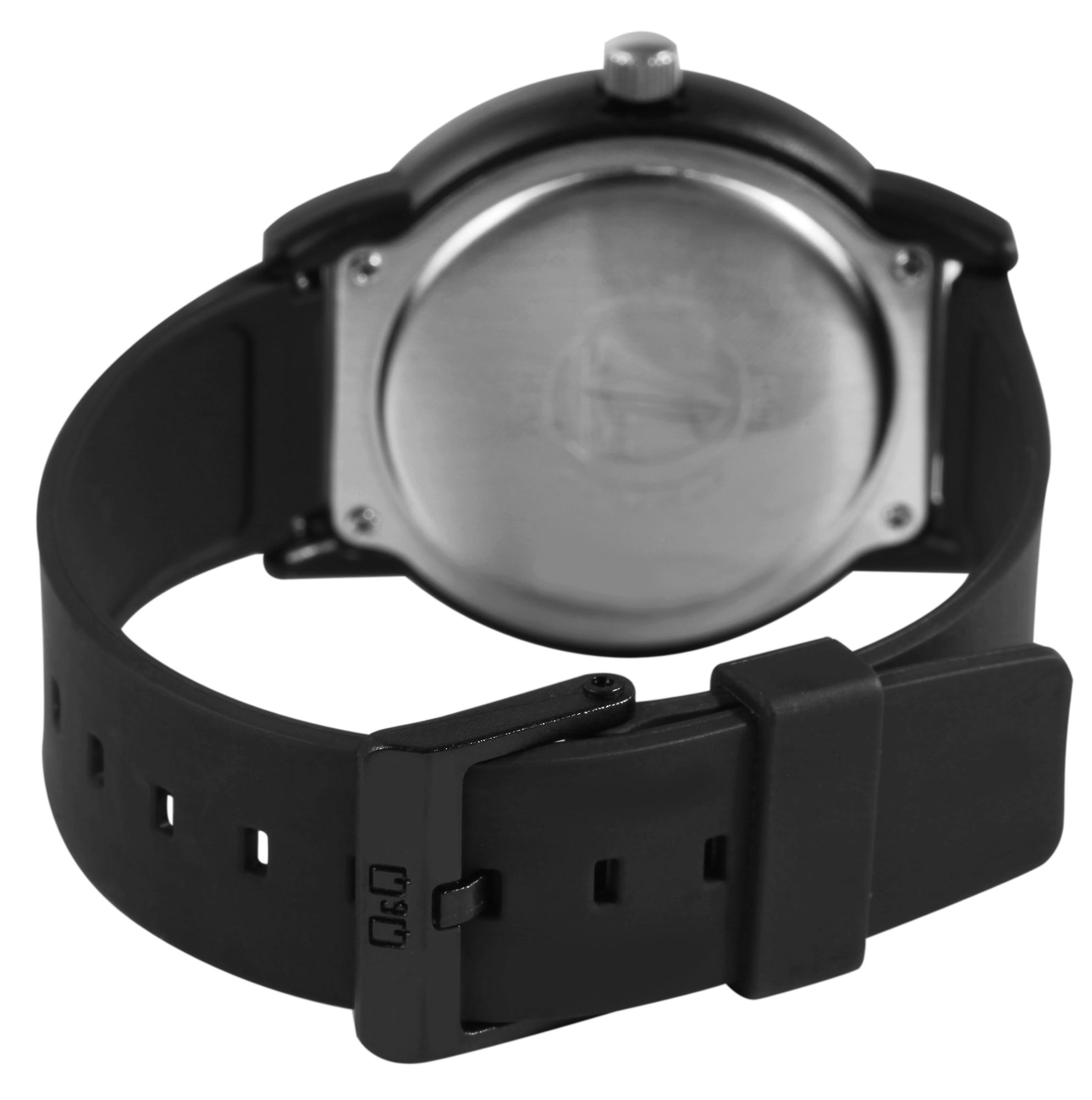 Die analoge 3-Zeiger Herrenarmbanduhr der Marke Q&Q - by Citizen Watch Co. LTD verfügt über ein hochwertiges und ganggenaues Quarzuhrwerk. Das schwarze Silikonarmband ist am Anstoß 20 mm breit und lässt sich mit einer schwarzen Dornschließe öffnen und schließen. Die Gesamtlänge der Uhr beträgt 24,5 cm. Das schwarze Kunststoffgehäuse mit Mineralglas hat eine Abmessung von 42 mm im Durchmesser und einer Gehäusehöhe von 11 mm. Der Gehäuseboden ist aus Edelstahl gefertigt und mit vier Edelstahlschrauben am Gehäuse befestigt. Die Uhrzeit lässt sich durch das übersichtlich gestaltete Zifferblatt ideal ablesen. Des Weiteren bietet die Armbanduhr durch das weiche Silikonarmband einen angenehmen Tragekomfort und lässt sich durch das sportliche Design wunderbar kombinieren. Zudem erweist sich das Material als besonders hautfreundlich und eignet sich dadurch ideal für Allergiker.