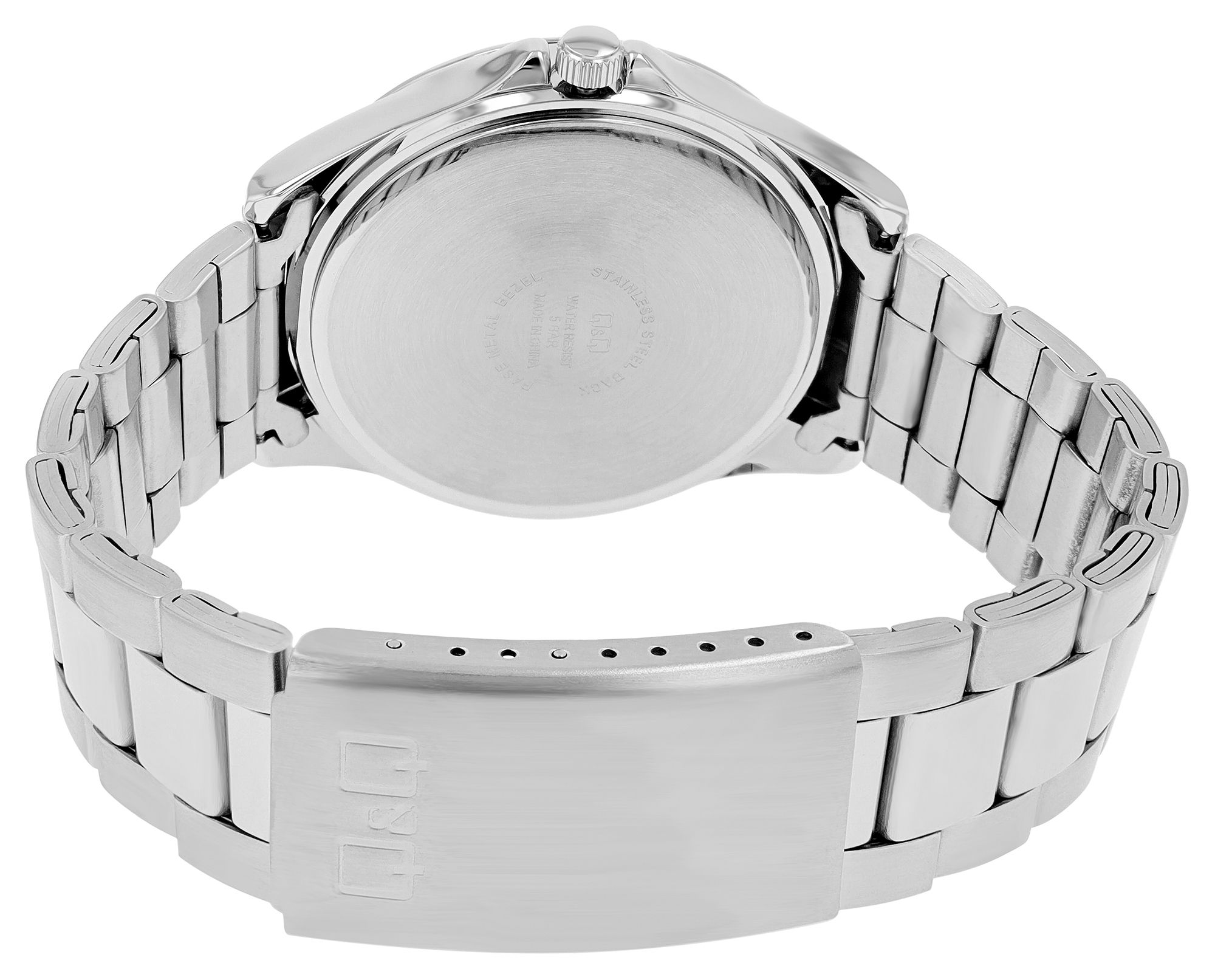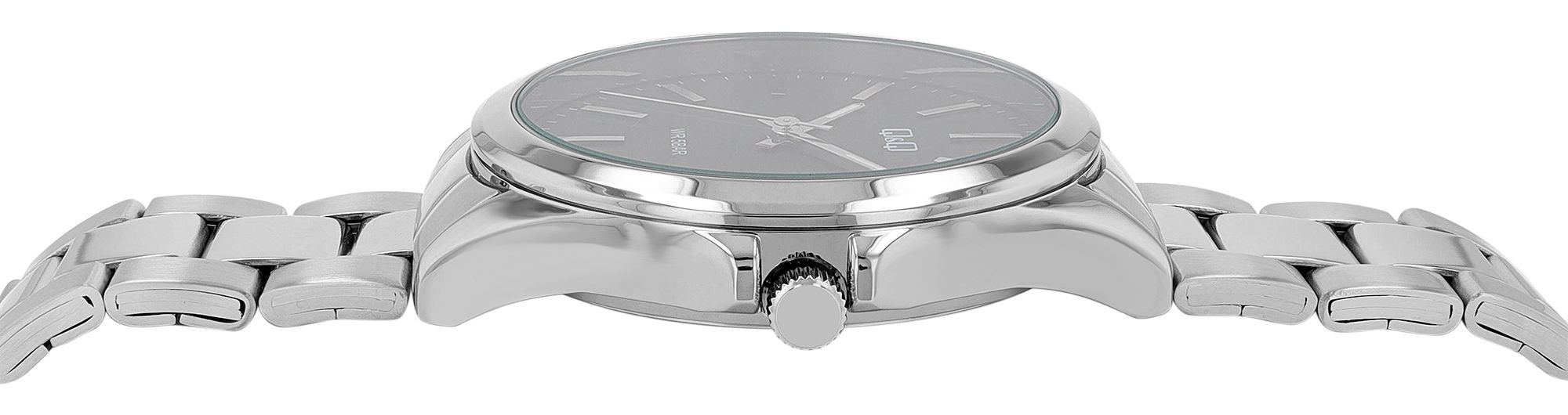 Eleganz, Präzision und Funktionalität ergeben ein harmonisches Gesamtbild in der Q&Q Herrenuhr mit Gliederarmband aus Edelstahl. Mit ihrem zeitlosen Design und der praktischen Datumsanzeige ist diese Uhr der perfekte Zeitmesser für jeden Anlass! Das Gliederarmband aus Edelstahl ist ein Blickfang an sich. Die Kombination aus mattierten und polierten Elementen verleiht einen raffinierten Kontrast. Mit einer Gesamtlänge von 23 cm und durch herausnehmbare Elemente ist das Armband flexibel, sodass es sich optimal an jedes Handgelenk anpassen lässt. Die Bandbreite von 22 mm betont die Robustheit und den anspruchsvollen Charakter dieser Herrenuhr.