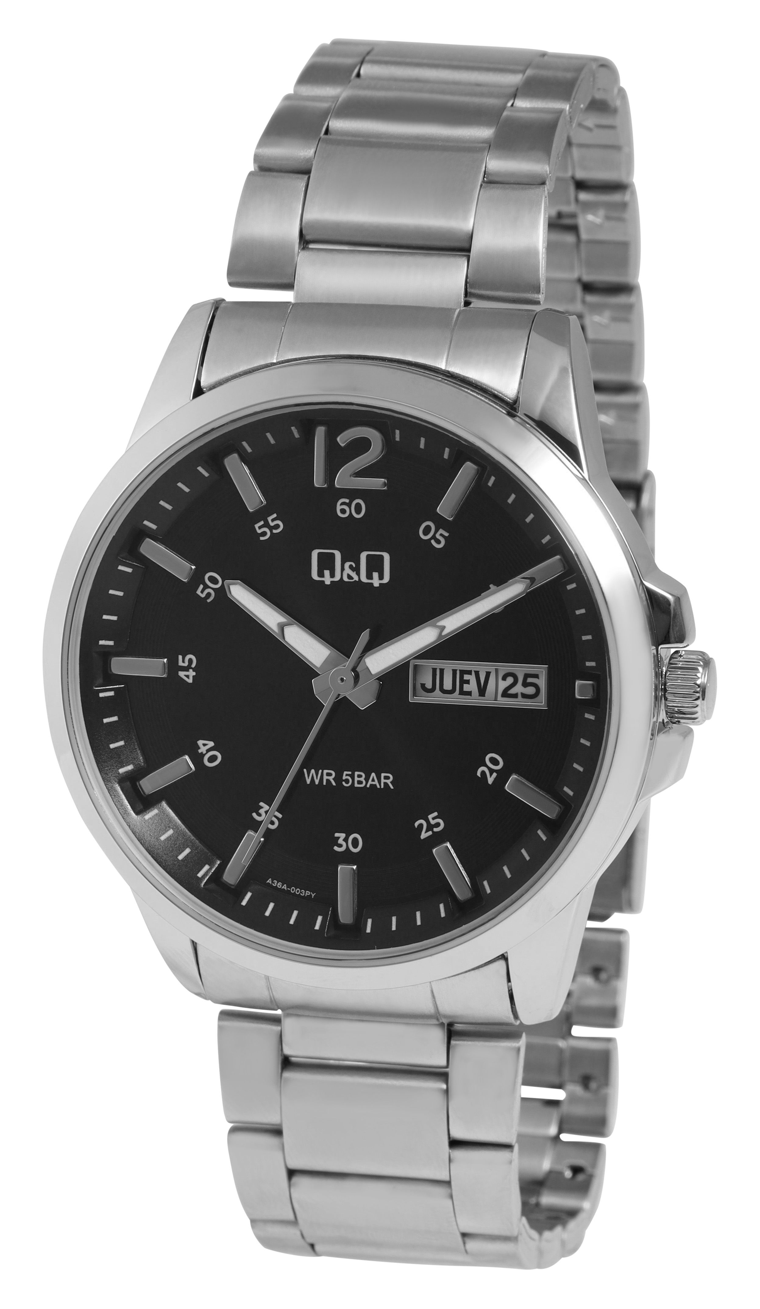 Produktinformationen "Q&Q Herrenuhr mit Edelstahlarmband, 5 ATM, spanisch & englische Wochentags- und Datumsanzeige, silberfarben/schwarz"